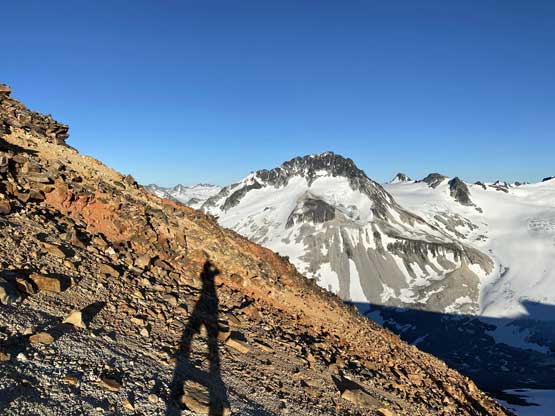 Ochre Mountain is a pile of red/orange choss, beautiful to look at but garbage to ascend. Thankfully the slope angle is pretty mellow on this peak such that one doesn’t quite need to use hands. This peak is often done combined with Salal Peak from Athelney Pass and this area has reputation to be beautiful. The three peaks on the east side of the pass – Ethelweard, Icemaker and Guthrum offer more rewarding mountaineering while the peaks on the west side of the pass offer more dramatic views including some close-up views of a volcanic feature called “The Elephant”. This was the 5th objective for Brayden and I, after completing Ethelweard, Icemaker, Guthrum and Salal earlier in the day. It’s shaping up to become a long ass day and we were looking to possibly finish in the dark.