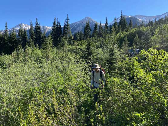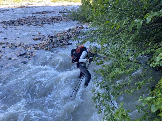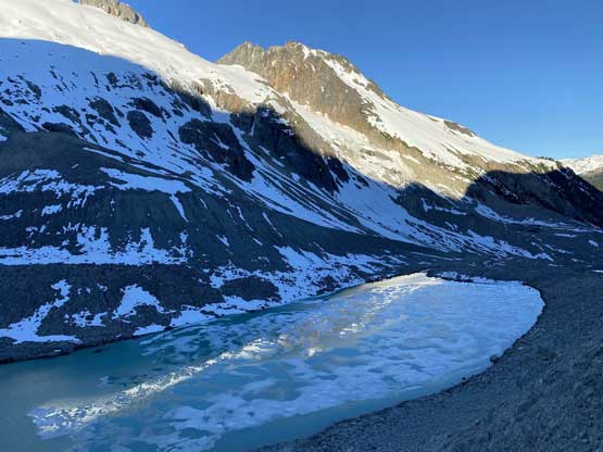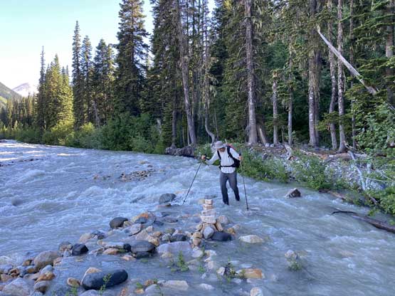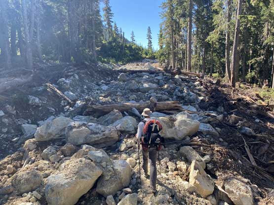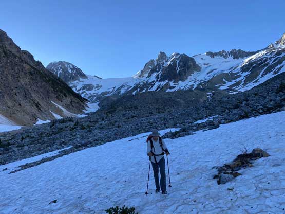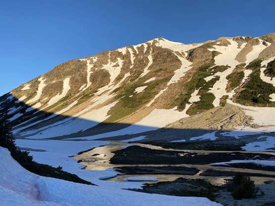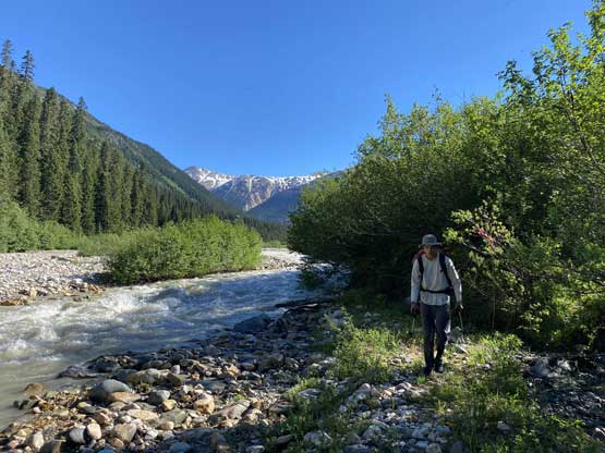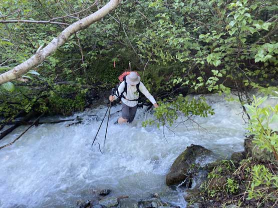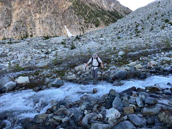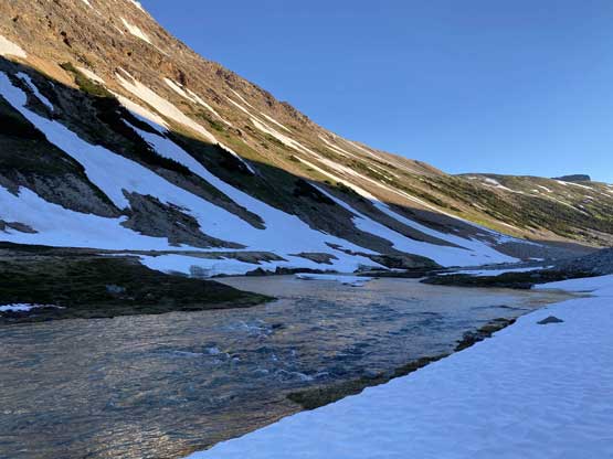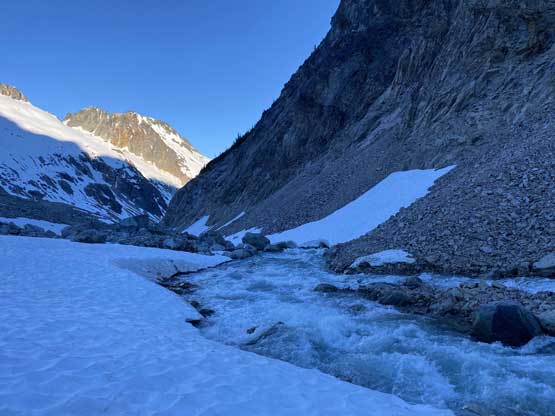 It’s very tempted to sleep in on the 3rd day of this trip but given the massive heat wave we both wanted to make the return hike a bit more pleasant, and to achieve so we must dash down a good portion of it before the sun hit us. We set the alarm at 4:30 am and started the descent right after 6 am. The temperature wasn’t too hot and the snow was actually better than the day before. For the first few kilometers we followed the Midnight Crew’s tracks traversing higher than we did on the way in and then managed to find that trail connecting to the crest of that massive moraine. This saved us some time because on the way in, we were boulder-hopping most of the time here. Descending that moraine was painful wearing mountaineering boots but once the slope angle petered out the going became much easier. We kept dashing down the valley until after the first (small) detour into the forest to bypass a bushy section, and then we finally got touched by the sun beams. I called for a break for a number of things but for the most notable I decided to finally swap mountaineering boots for the trail shoes. I had hauled three pairs of footwear and I must justify it by using all three pairs relatively equally. The sandals were obviously useless here but they were crucial for camping comfort and also for wading Salal Creek.