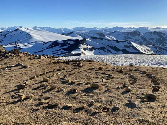 From the gentle ridge connecting with “The Elephant” we had to lose about 50 m elevation into the basin before slogging onto Ochre Mtn.’s W/SW Ridge. This basin was full of boulders in the summer but for us, it was a simple plod on snow. While grunting onto the Ochre’s ridge we started to post-hole seriously in isothermal and thin areas. The original plan was to traverse farther out on snow to bypass the scrambling on the west ridge but given the crappy snow we opted to use rocks. After hitting the west ridge of Ochre Mtn. we ditched the pack.
