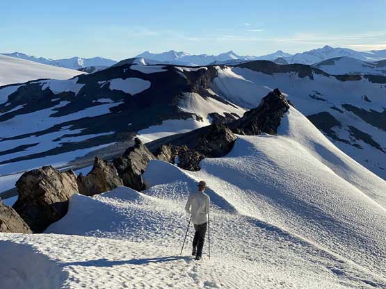 Ochre Mountain is a pile of red/orange choss, beautiful to look at but garbage to ascend. Thankfully the slope angle is pretty mellow on this peak such that one doesn’t quite need to use hands. This peak is often done combined with Salal Peak from Athelney Pass and this area has reputation to be beautiful. The three peaks on the east side of the pass – Ethelweard, Icemaker and Guthrum offer more rewarding mountaineering while the peaks on the west side of the pass offer more dramatic views including some close-up views of a volcanic feature called “The Elephant”. This was the 5th objective for Brayden and I, after completing Ethelweard, Icemaker, Guthrum and Salal earlier in the day. It’s shaping up to become a long ass day and we were looking to possibly finish in the dark.