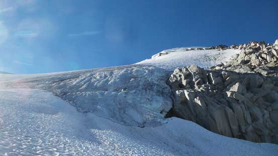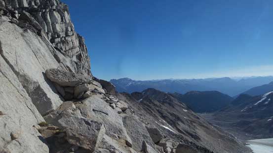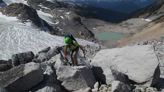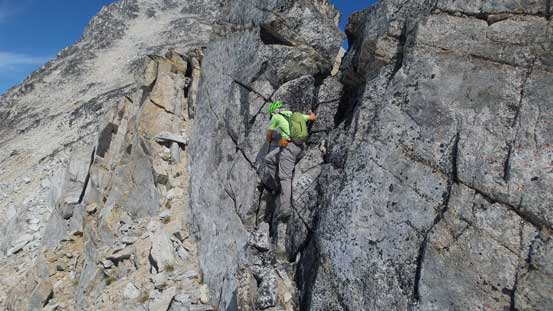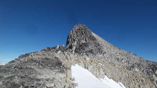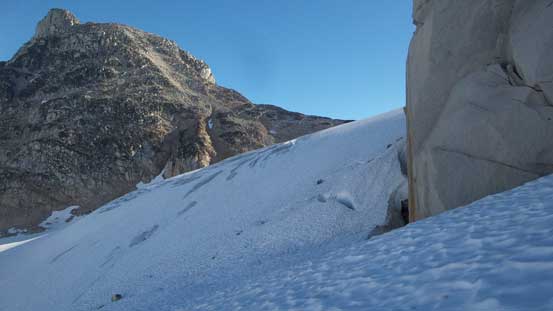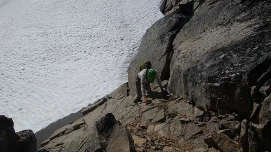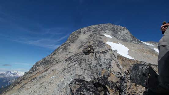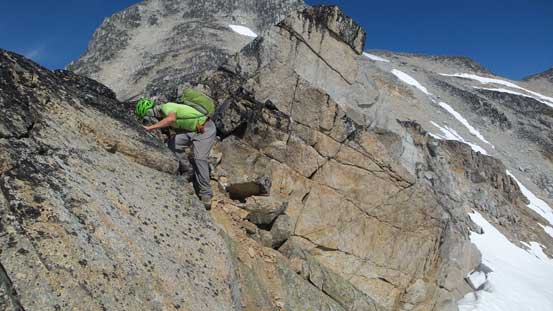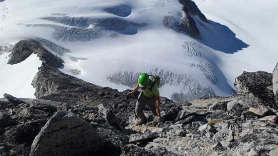 The first business in the morning was descending and contouring around the N/NW side of Madhorse Mountain to Madhorse/Overseer col. This looked tame on paper but involved fair amount of glacier travel. There’s at least a couple small crevasses which we had to either step across or detour around. To gain the SE Ridge wasn’t easy neither. The rocks were horribly loose that we sent lots of microwaves down. After gaining the ridge we realized we probably had picked a wrong spot (too far south) that to correct this mistake we had to negotiate a section of exposed 4th class knife-edge. To be honest this was actually the scrambling highlight on this peak such that on the way back we opted to down-climb it just to have more fun. And then the lower SE Ridge/Face was a tedious grunt with some loose rocks.