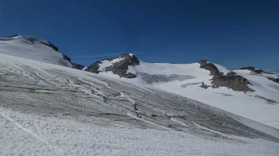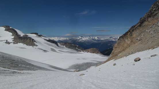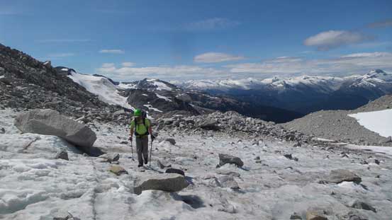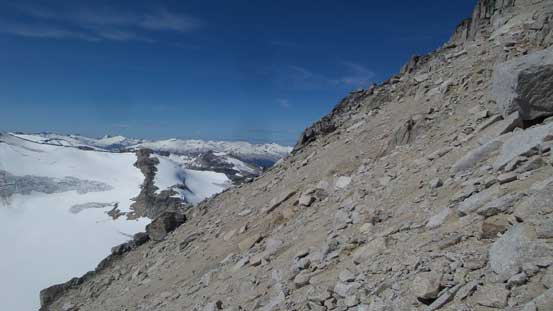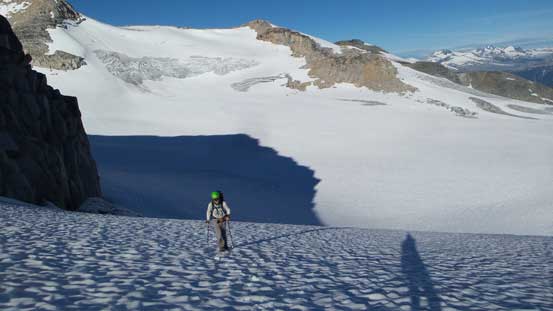 Back onto the glacier our next stage was to descend a long ways on the edge and then re-ascend the valley between Uriah’s Heap and Spidery Peak. This section has more descending than we were hoping for and then the initial 100 m getting out of the glacial valley looked pretty terrible. But what else we could do….