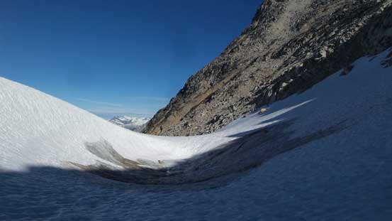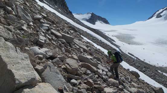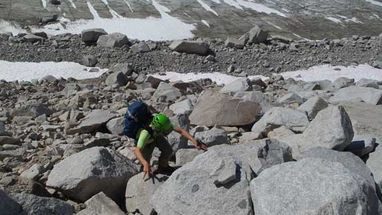 After carefully descending the summit block we stayed further to the skier’s right on scree. This served pretty well on the lower face. I had thought about bailing onto the glacier earlier but we had our backpacks ditched earlier in the day plus that section of 4th class was pretty enjoyable so we just reversed our exact route. While surfing down the choss pile we sent one or two refrigerators down and thankfully they didn’t roll onto our backpacks…