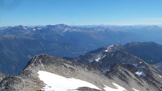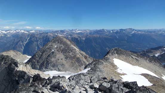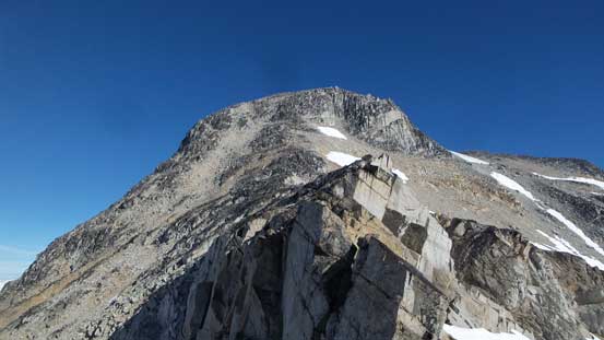 After a long while the terrain transitions to steeper but blocky and solid granite. We picked a more direct line up dealing with 3rd class steps here and there. Going up further climber’s left would be easier but with more scree bashing. This section of fun scrambling ends at a high plateau feature. The summit block appeared to be pretty fearsome but actually not too bad. The scrambling never exceeds “low 3rd class” while attacking from climber’s right side. The summit offers some of the best views I’d ever got so we took a long break soaking everything in.