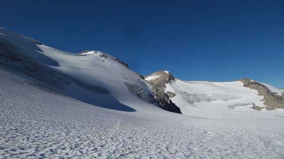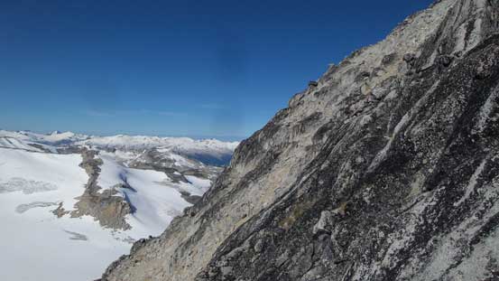 Back onto the glacier our next stage was to descend a long ways on the edge and then re-ascend the valley between Uriah’s Heap and Spidery Peak. This section has more descending than we were hoping for and then the initial 100 m getting out of the glacial valley looked pretty terrible. But what else we could do….