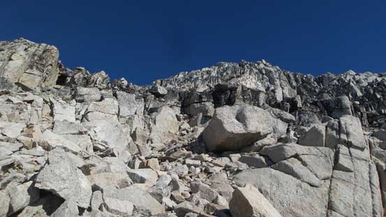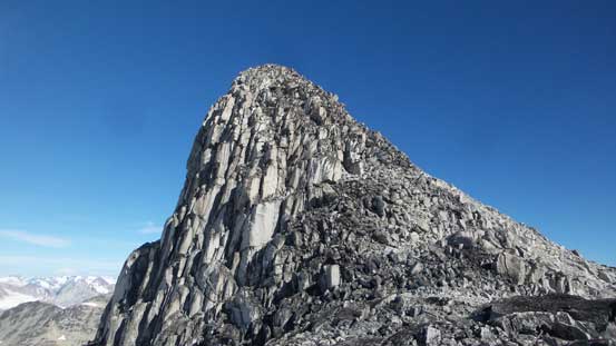 After a long while the terrain transitions to steeper but blocky and solid granite. We picked a more direct line up dealing with 3rd class steps here and there. Going up further climber’s left would be easier but with more scree bashing. This section of fun scrambling ends at a high plateau feature. The summit block appeared to be pretty fearsome but actually not too bad. The scrambling never exceeds “low 3rd class” while attacking from climber’s right side. The summit offers some of the best views I’d ever got so we took a long break soaking everything in.