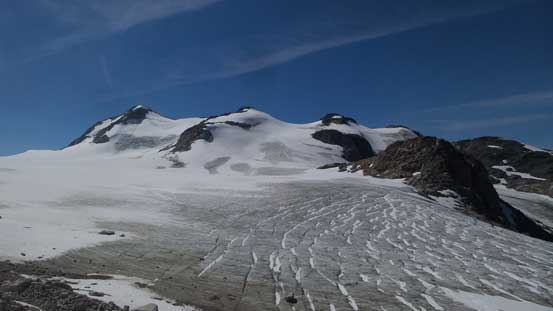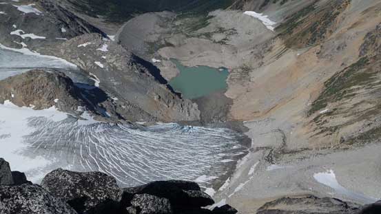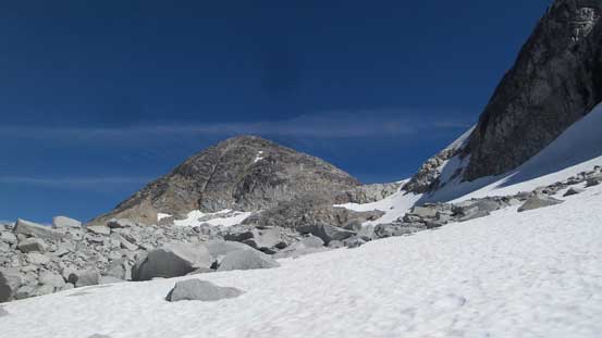 After carefully descending the summit block we stayed further to the skier’s right on scree. This served pretty well on the lower face. I had thought about bailing onto the glacier earlier but we had our backpacks ditched earlier in the day plus that section of 4th class was pretty enjoyable so we just reversed our exact route. While surfing down the choss pile we sent one or two refrigerators down and thankfully they didn’t roll onto our backpacks…