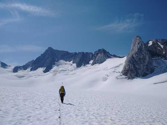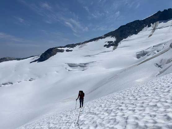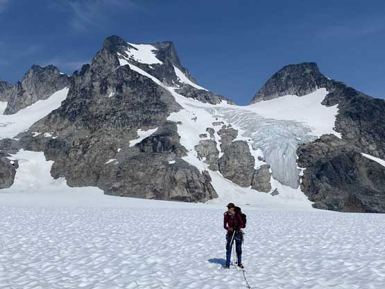Ellie and I roped up for the crossing of Manatee Glacier as it looked to be a serious one towards the high col. Even while crossing this main icefield we encountered a lot of small cracks. As we ascended higher towards Remora/Manatee col we easily weaved around some major crevasses on the lower slopes but the challenge was actually the top section that was not visible from our earlier camp. We stayed a bit too far on climber’s left and had to hop across a few cracks and probe like crazy because the snow was generally thin and not supportive. Overall I wouldn’t say this was a difficult navigation but we did have to focus 100% especially with just two people in the rope team. To gain the actual col we also had to scramble a section of very loose choss, which was unpleasant but not difficult.