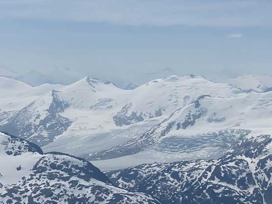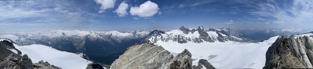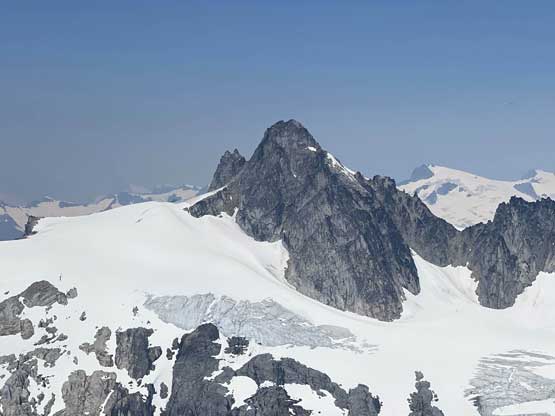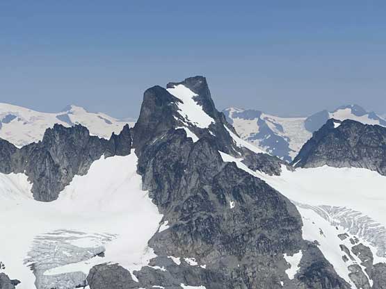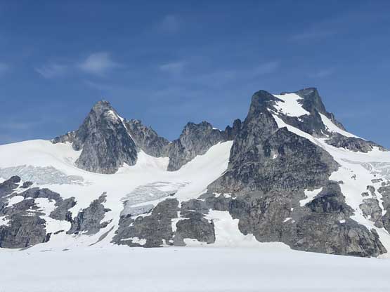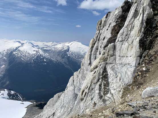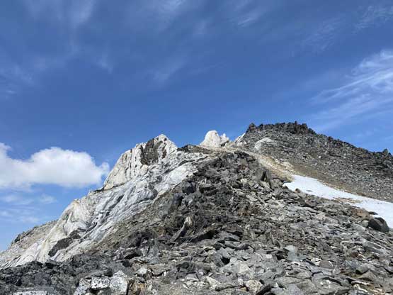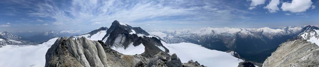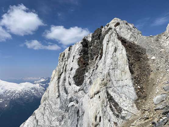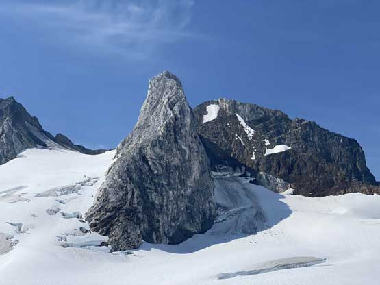Remora Peak is a small summit right next to Manatee Peak that boasts hardly any prominence but this peak does have a cool-looking north face and an impressive “north buttress”. To ascend this peak is an easy scramble from Remora/Manatee col via the east ridge. The rock quality in this group of peaks is not nearly as good as on Wahoo Tower further to the north and parties that came all the way to this remote area were likely on skis as part of some traverses. I did this as a simple add-on to the Wahoo Tower trip. This was already the 3rd day of the expedition. Jason and Rob decided to walk around Remora Peak to aim directly at the planned camp at the toe of Elaho Glacier while Ellie and I opted to take a high route over Remora/Manatee col, mostly because I needed to bag Manatee Peak in this trip.
