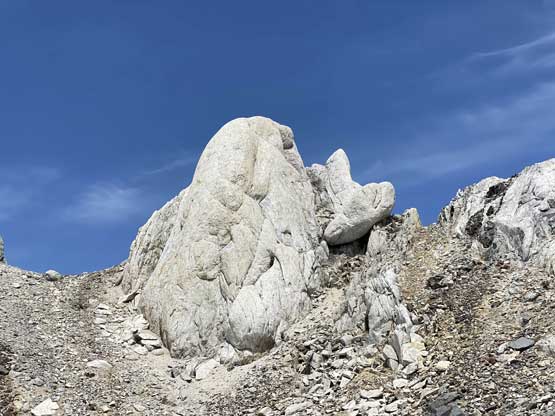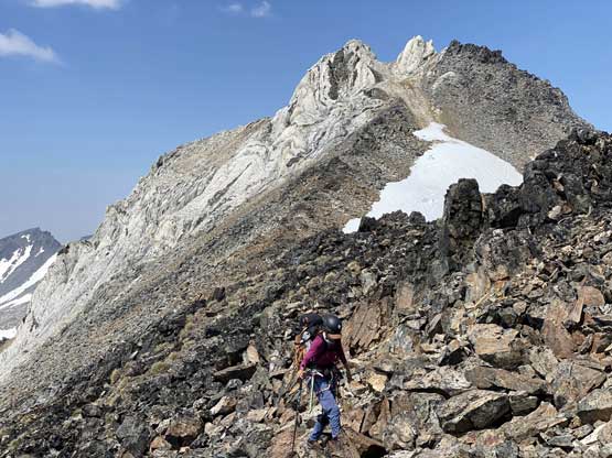 The original plan was for the two of us to scramble Manatee Peak together and Remora Peak was just an add-on, so Ellie decided to stay back to sort out the rope. I figured the ascent of Remora Peak wouldn’t take more than 20 minutes round trip from this col, so pressed on to tag the summit. There was some cool scrambling on limestone near the summit but otherwise it’s just a plod. And once back to the col we carried on towards Manatee Peak.