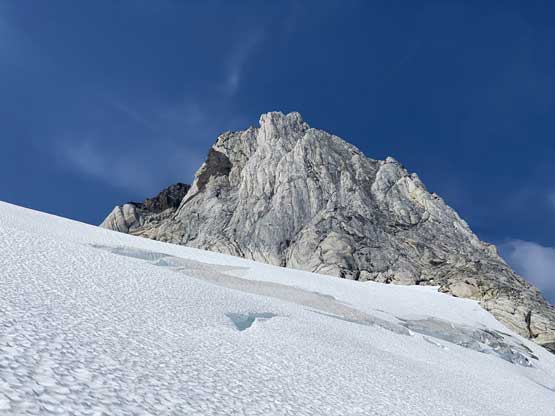 Ellie and I roped up for the crossing of Manatee Glacier as it looked to be a serious one towards the high col. Even while crossing this main icefield we encountered a lot of small cracks. As we ascended higher towards Remora/Manatee col we easily weaved around some major crevasses on the lower slopes but the challenge was actually the top section that was not visible from our earlier camp. We stayed a bit too far on climber’s left and had to hop across a few cracks and probe like crazy because the snow was generally thin and not supportive. Overall I wouldn’t say this was a difficult navigation but we did have to focus 100% especially with just two people in the rope team. To gain the actual col we also had to scramble a section of very loose choss, which was unpleasant but not difficult.