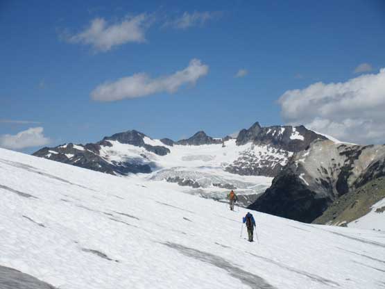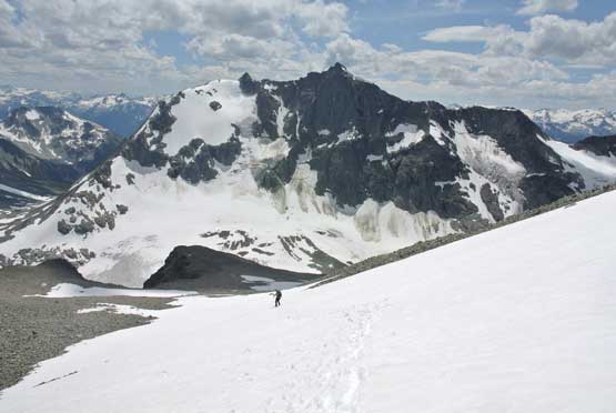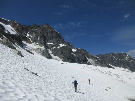 The objective on this day was to bag both Sessel Mountain and Mt. Delilah so we had to resist the temptation of lingering at camp for too long. The side-hill traverse across Boomerang Glacier to the base of Sessel Mountain’s south slopes was a bit steeper than expected and we had to route-find around several small crevasses. The snow was thin and isothermal that we didn’t want to blindly trust the strength of it. The view of the north face of Mt. Delilah was rad though that kept drawing us to look back. At the base of Sessel Mtn. south slope we ditched the unnecessary snow and ice gears and turned on the slogging mode.