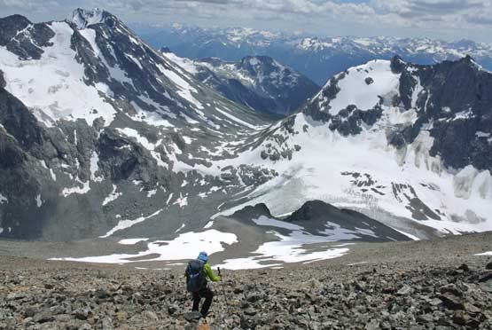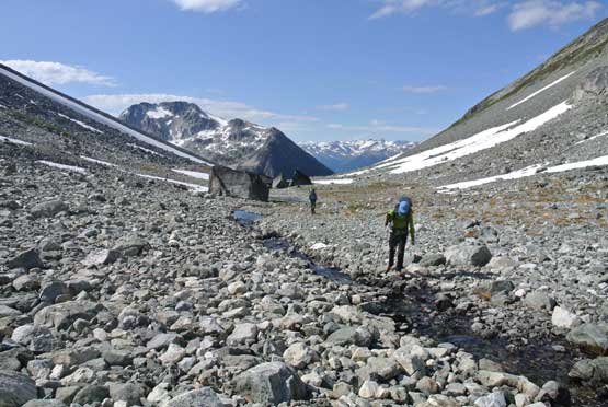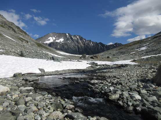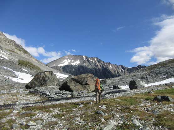 Sessel Mountain is a sizeable massif north of Boomerang Glacier in the vicinity of North Creek and Hurley River and boasts a steep, glaciated north face, but because of the close proximity to the even-bigger Mt. Sampson this peak is often overlooked. Adding to that the standard route is nothing but a treacherous scree ascent for 800 vertical meters up the south face and that’s quite a slog even for peak-baggers like myself. The approach would take one long day no matter where you come from – North Creek Cabin, Hurley River valley or the south side and the best way to do Sessel Mountain is to combine it with several other peaks in several days, and that’s how Alex, Paul and I did it.
