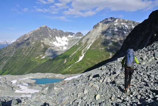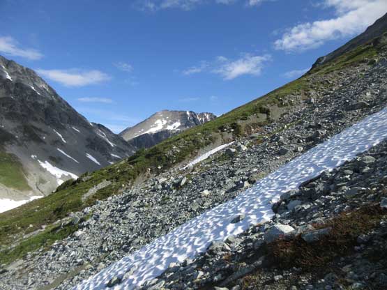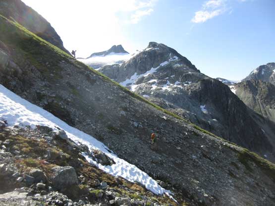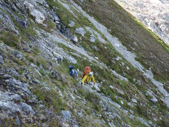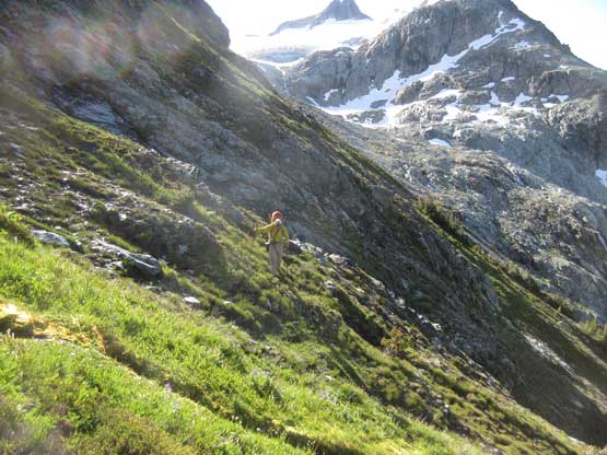 On the first day we traversed over “Zorah Peak“, tagged “Trapeze Peak” and made the summit bid on Mt. Sampson and camped at the base of Mt. Sampson’s south face. The first business of Day 2 was traversing/descending to the broad pass between Mt. Sampson and Mt. Delilah where we would set up the basecamp for both Sessel Mountain and Mt. Delilah. The traverse would be over 2 km long and all on tedious side-hill country, and with heavy packs but we had to face it. The first section getting down and around a waterfall was the worst with lots of moraine type of choss to deal with. The second half had a ton of steep grass but because the weather had been dry I found side-hilling on grass was no problem in this particular trip. We could have camped at about 500 horizontal meters below the pass with running water but decided to carry all the way to the pass in search for a none-windy spot, but there was no such spot. We picked one spot to pitch the tents nonetheless and spent some time building a wind shelter.