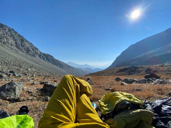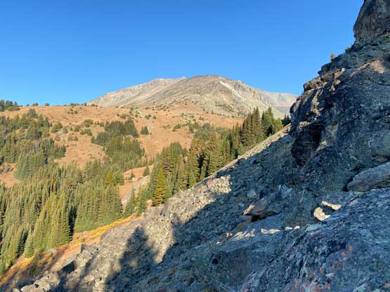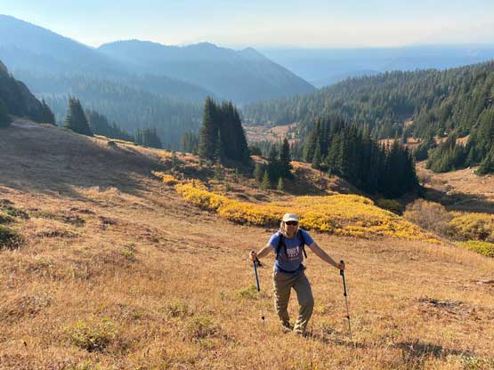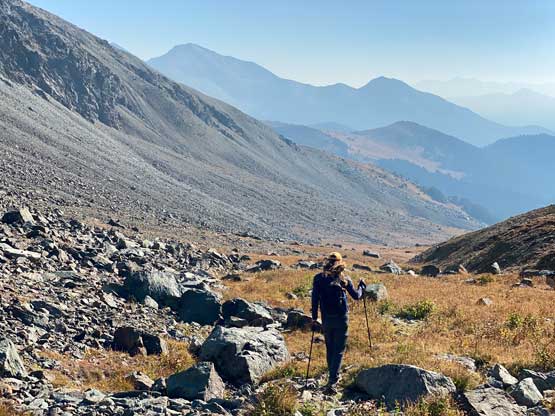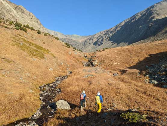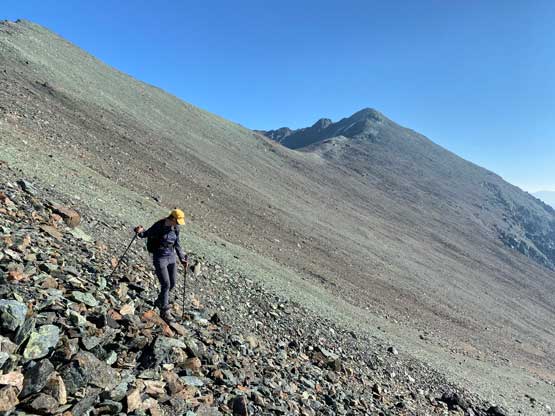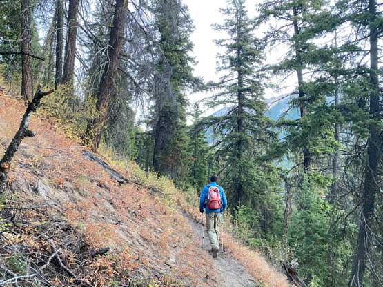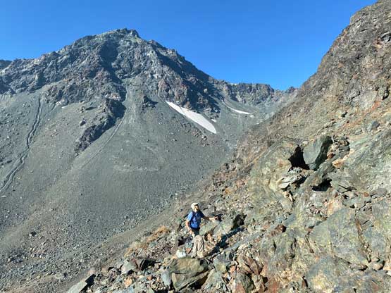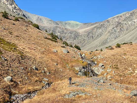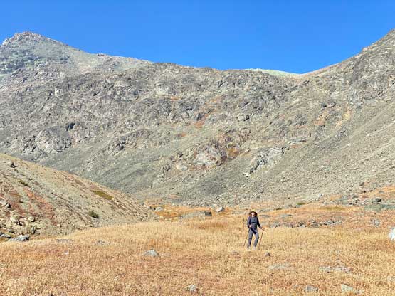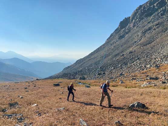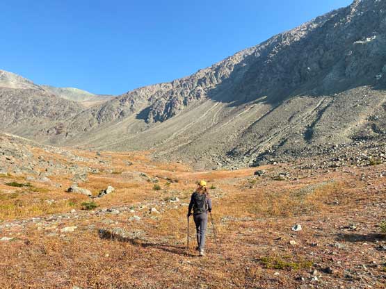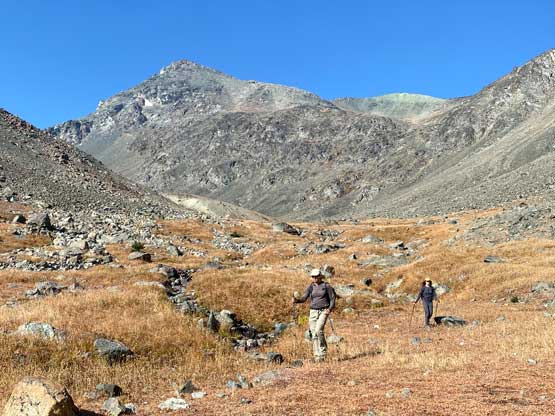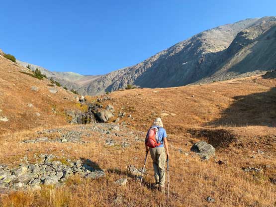 Sarah has an excellent sleeping set-up in the truck that made me feel as comfortable as at home. Poor Vlad had to sleep in his own tent in the cold. There’s a lot of condensation in the morning. We all got up at around 6:40 am and managed to start the plod an hour later. The trail in Brett Creek drainage was in some excellent shapes but we soon learnt the reason, as this area seems to frequent horse traffics. Nonetheless the plod up Brett Creek trail was boring and monotonous, but because of the excellent trail conditions we also dispatched elevation and distance more quickly than I thought. We started the hike at 1300 m elevation and joined Shulaps Traverse trail at at horse camp just under 2000 m elevation. There seemed to have multiple trails in the next zone and we somehow took a wrong one. The correct bearing was to take the leftmost trail with some elevation loss upon reaching any intersection, that we learnt later on the return. The wrong trail soon took a sharp right turn going towards the opposite direction that we wanted, so we left the trail, thrashed across some drainages with dense vegetation, and did a side-hill traverse across boulders to get back into the upper Brett Creek drainage. We then had no problem plodding up the grass and meadows in this drainage and this section finally had some Chilcotins feel with broad valleys and tall walls.