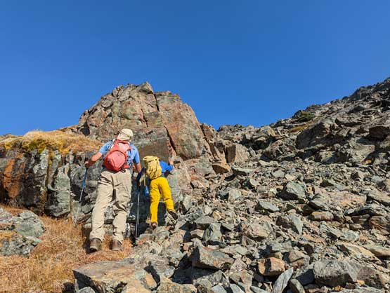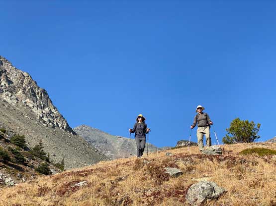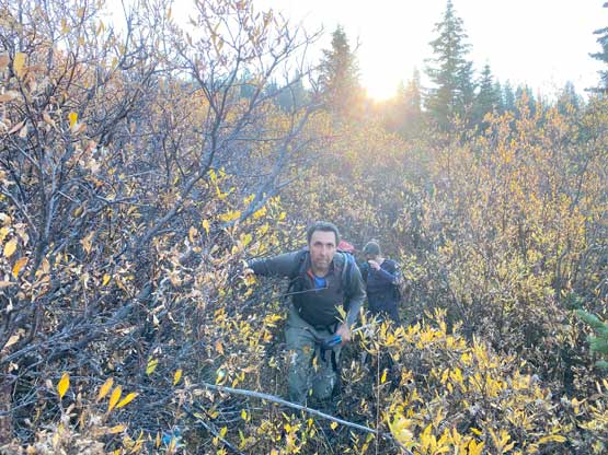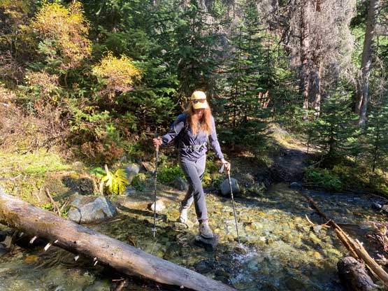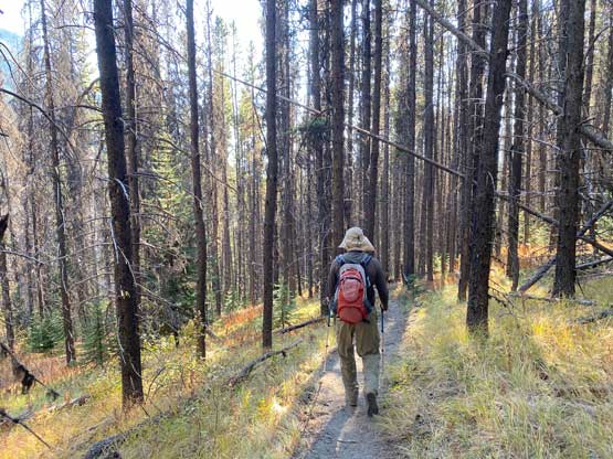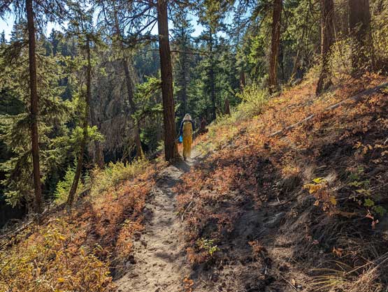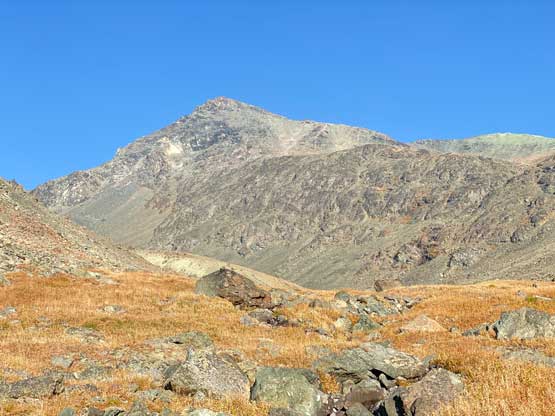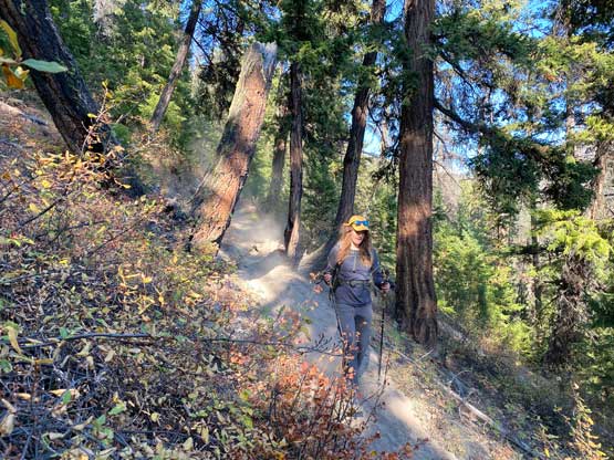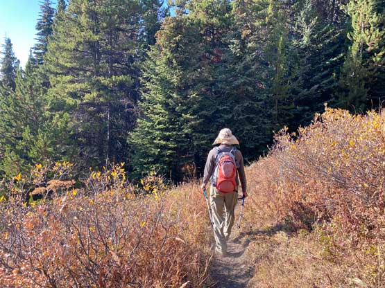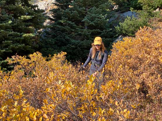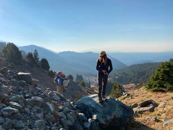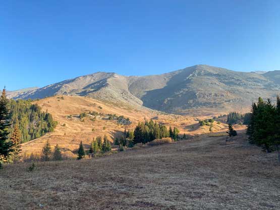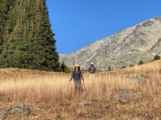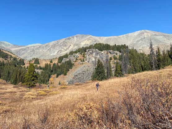 Sarah has an excellent sleeping set-up in the truck that made me feel as comfortable as at home. Poor Vlad had to sleep in his own tent in the cold. There’s a lot of condensation in the morning. We all got up at around 6:40 am and managed to start the plod an hour later. The trail in Brett Creek drainage was in some excellent shapes but we soon learnt the reason, as this area seems to frequent horse traffics. Nonetheless the plod up Brett Creek trail was boring and monotonous, but because of the excellent trail conditions we also dispatched elevation and distance more quickly than I thought. We started the hike at 1300 m elevation and joined Shulaps Traverse trail at at horse camp just under 2000 m elevation. There seemed to have multiple trails in the next zone and we somehow took a wrong one. The correct bearing was to take the leftmost trail with some elevation loss upon reaching any intersection, that we learnt later on the return. The wrong trail soon took a sharp right turn going towards the opposite direction that we wanted, so we left the trail, thrashed across some drainages with dense vegetation, and did a side-hill traverse across boulders to get back into the upper Brett Creek drainage. We then had no problem plodding up the grass and meadows in this drainage and this section finally had some Chilcotins feel with broad valleys and tall walls.