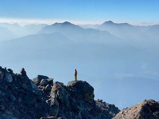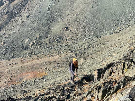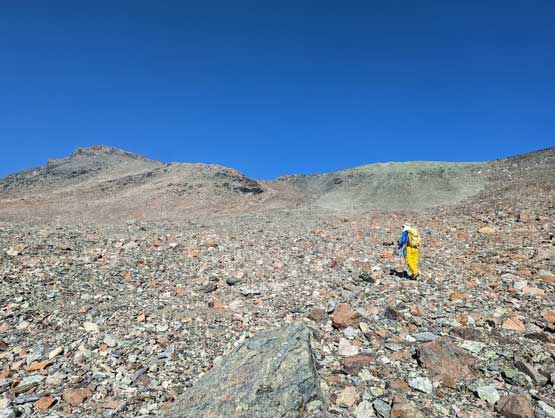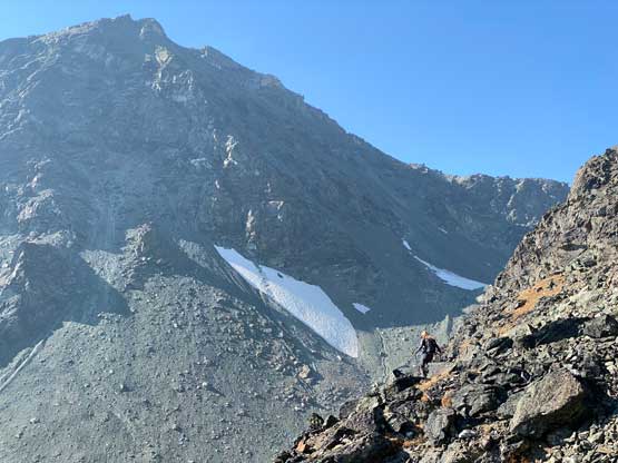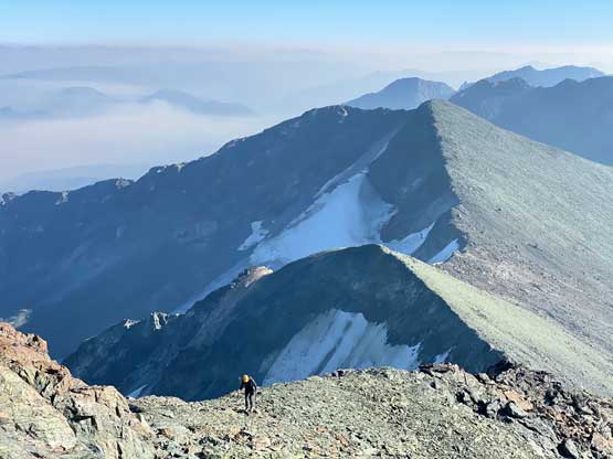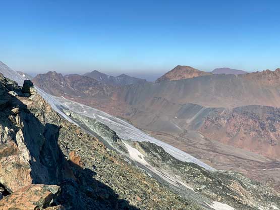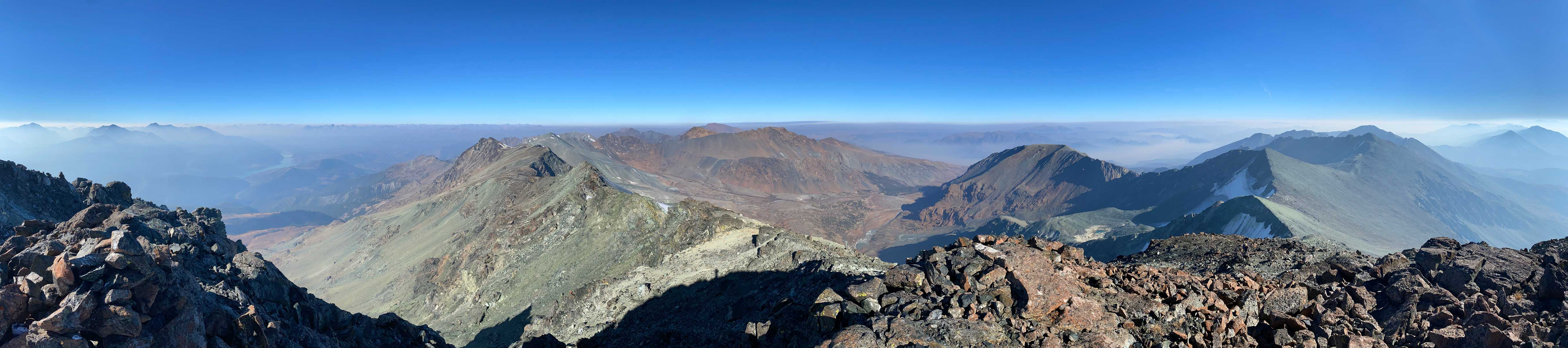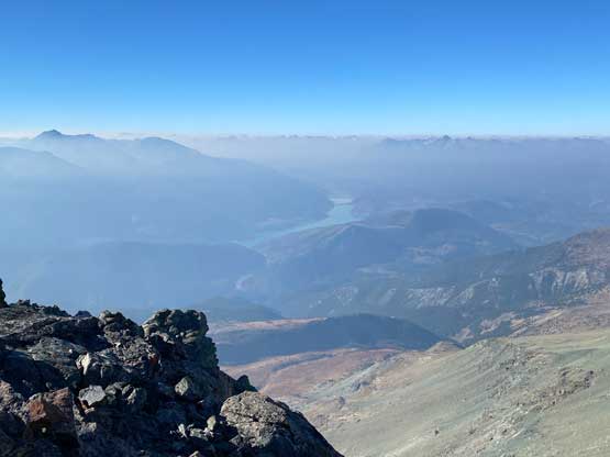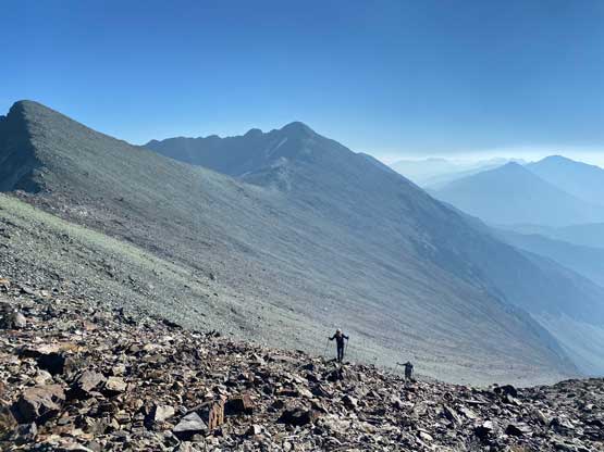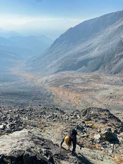 We ditched some unnecessary gears and I swapped footwear from trail runners to mountaineering boots at the base of our ascent route. The packs suddenly felt much lighter as I had brought too much redundant gears for contingency purposes. To get out of this cirque surrounded by Shulaps Peak and its south peak we had to deal with some steep terrain, but it wasn’t as bad as it looked from afar. The entire scramble could be done in the realm of “class 2” but we on purposed picked some 4th class steps for fun. Above the steep parts we plodded into the “upper cirque” with a significantly foreshortened slope leading upward into a shallow notch on Shulaps Peak’s east ridge. The wind picked up dramatically once hitting the ridge, but it wasn’t cold and we also finally ascended above the smoke layer that had been obscuring the views earlier in the day. The plod up the east ridge onto the summit was definitely the highlight with great views towards all directions. At this point we made the decision to omit add-on summits as they all seemed rather boring, so we might as well do a long stay on the high point to soak in our first Shulaps Range experience.