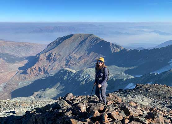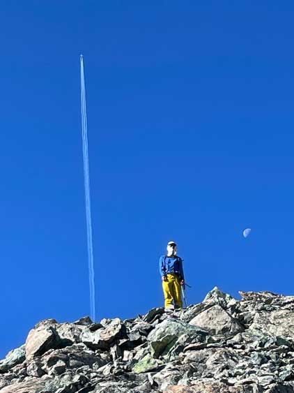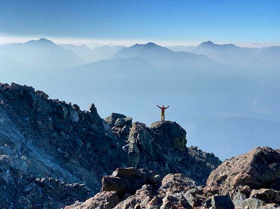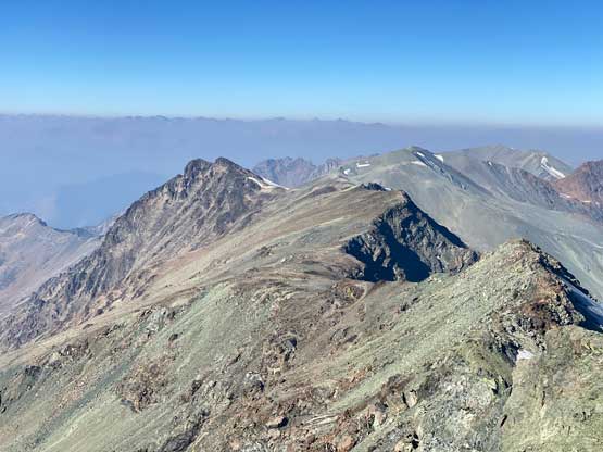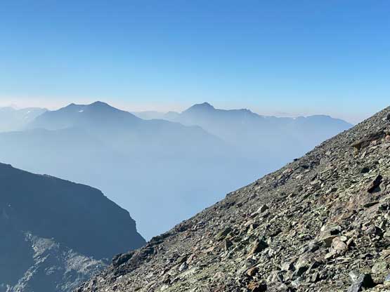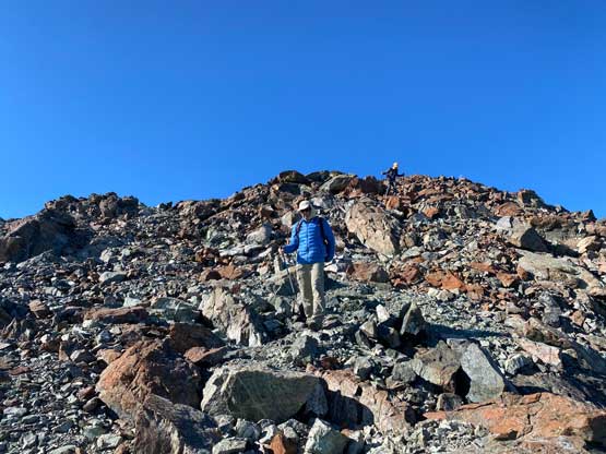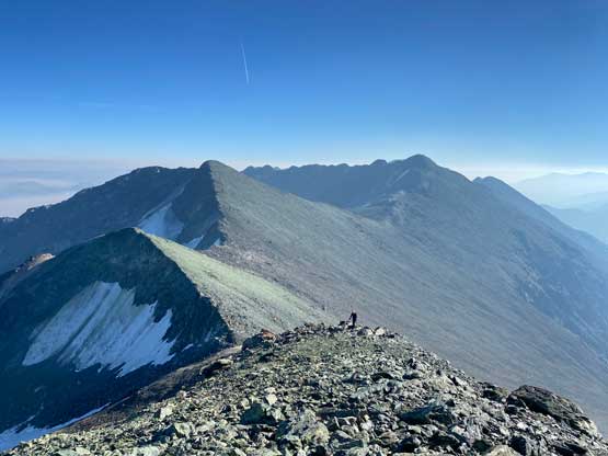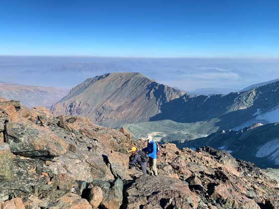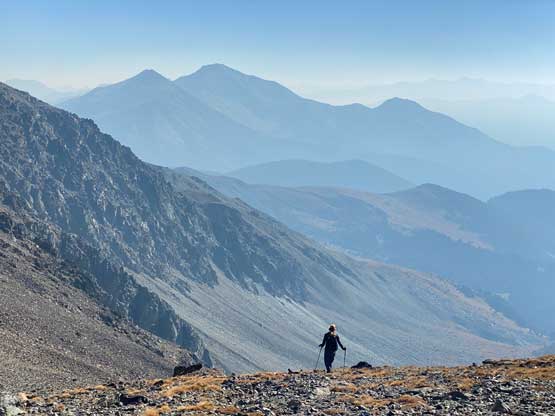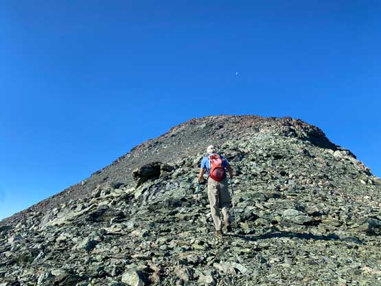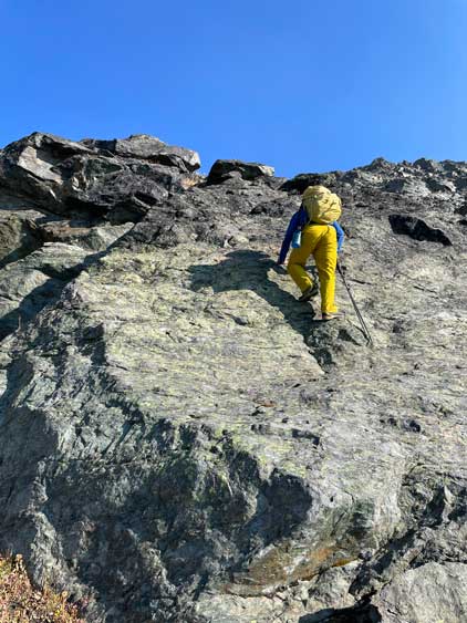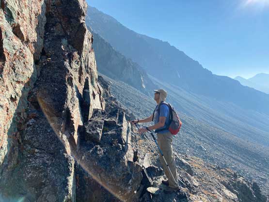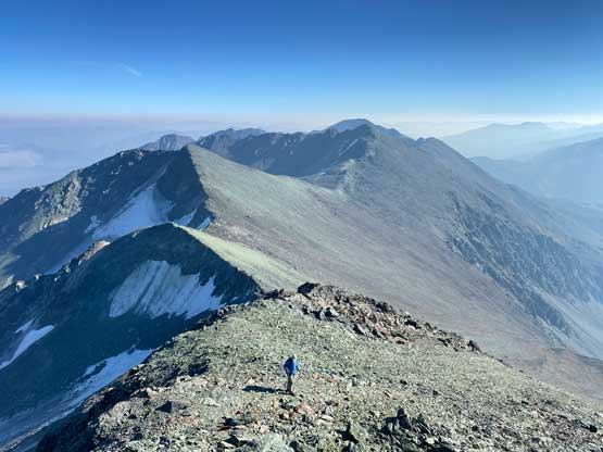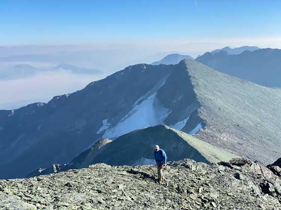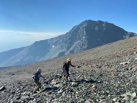 We ditched some unnecessary gears and I swapped footwear from trail runners to mountaineering boots at the base of our ascent route. The packs suddenly felt much lighter as I had brought too much redundant gears for contingency purposes. To get out of this cirque surrounded by Shulaps Peak and its south peak we had to deal with some steep terrain, but it wasn’t as bad as it looked from afar. The entire scramble could be done in the realm of “class 2” but we on purposed picked some 4th class steps for fun. Above the steep parts we plodded into the “upper cirque” with a significantly foreshortened slope leading upward into a shallow notch on Shulaps Peak’s east ridge. The wind picked up dramatically once hitting the ridge, but it wasn’t cold and we also finally ascended above the smoke layer that had been obscuring the views earlier in the day. The plod up the east ridge onto the summit was definitely the highlight with great views towards all directions. At this point we made the decision to omit add-on summits as they all seemed rather boring, so we might as well do a long stay on the high point to soak in our first Shulaps Range experience.