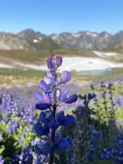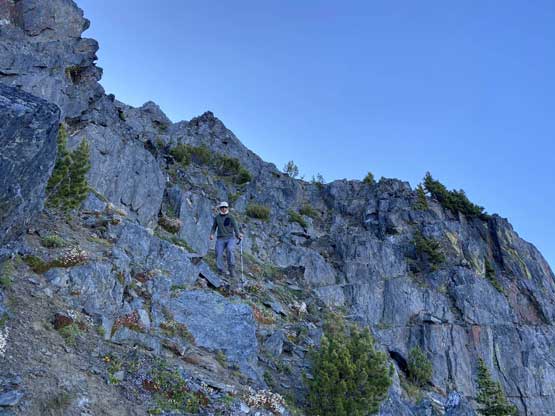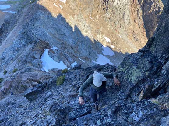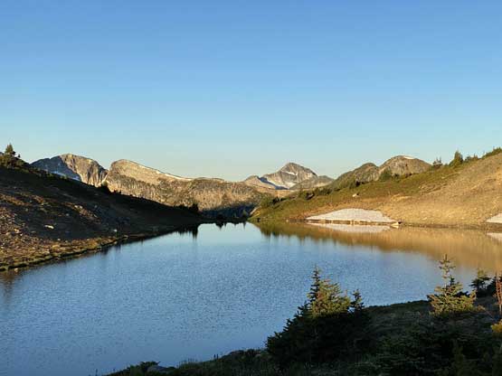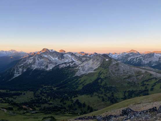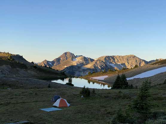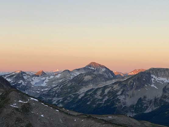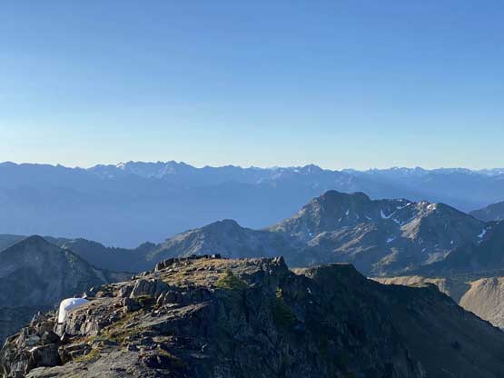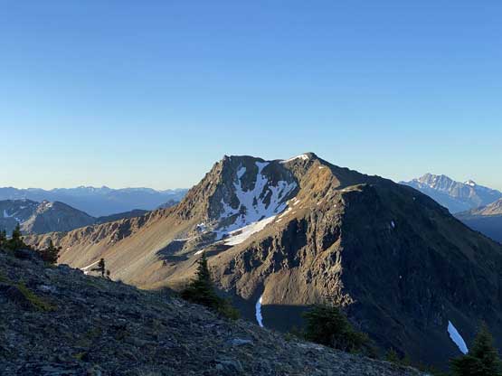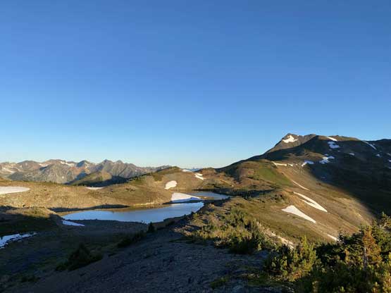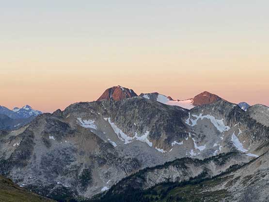 Alex had already done Star Mountain on his previous attempt to ascend Whitecap Mountain so Vlad and I woke up early and plodded eastward on our own. We managed to get going at around sunrise. We firstly had to plod over the shoulder of a small hump but we needed not have to ascend to the top of that hump. Then we easily descended to a set of alpine lakes where two groups were camping. When we passed by their tents they were still sleeping. The terrain on the plod to Star Mountain was surprisingly easy with no talus hopping nor side-hilling on steep grass, that we managed to make progress fairly quickly. The peak appeared fairly imposing from afar but Alex didn’t mention any difficulty on the ascent so we assumed the route just went up the west ridge. At the base of the scramble we ditched the backpacks. We did have to do some detouring on climber’s right side but generally stuck to the ridge crest. There were numerous false summits and the scrambling was “class 3” at most.