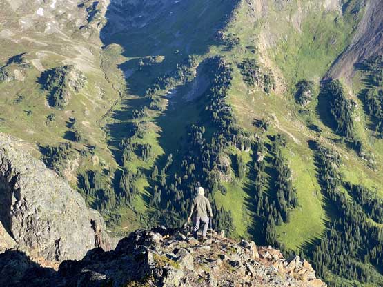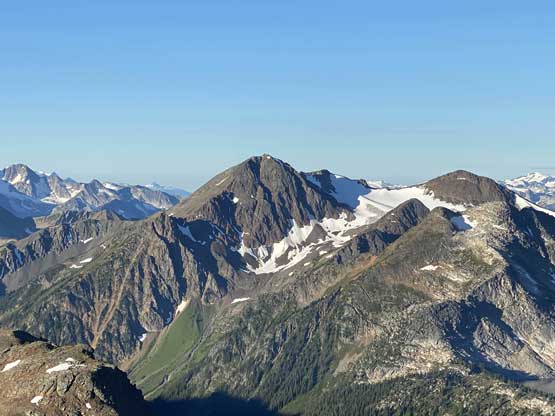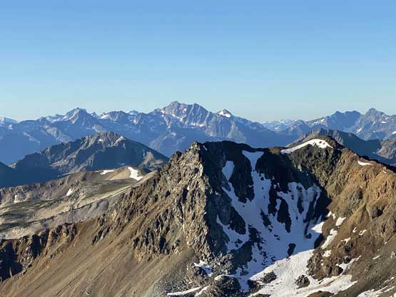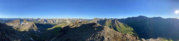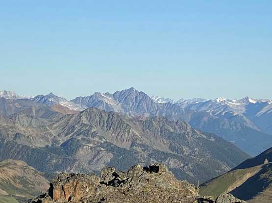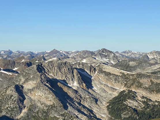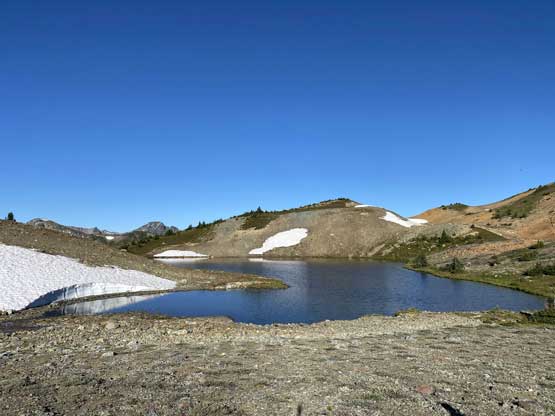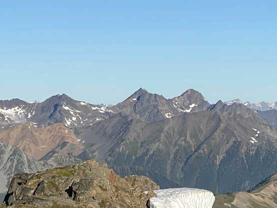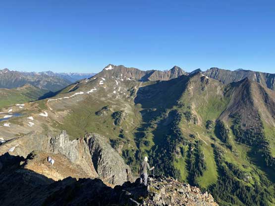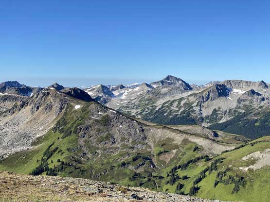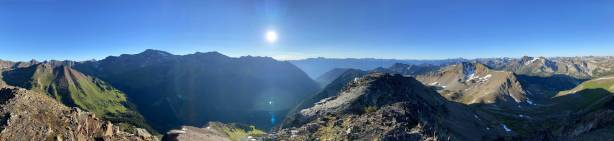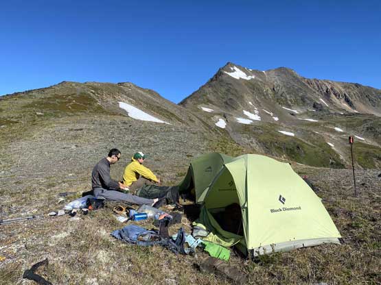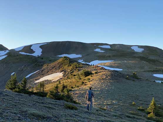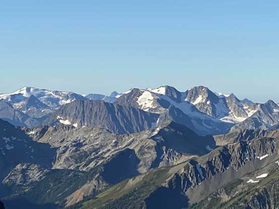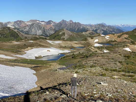 The views were pretty nice on the summit but we had a long day ahead so immediately turned around and plodded down. On the descent we found some easier bypasses to avoid the 3rd class sections and in no time we were back to the lakes. We loaded up the water bottles at a stream above the lakes, and then had a leisure plod back to camp. We would then break camp and move towards Mt. McGillivray.