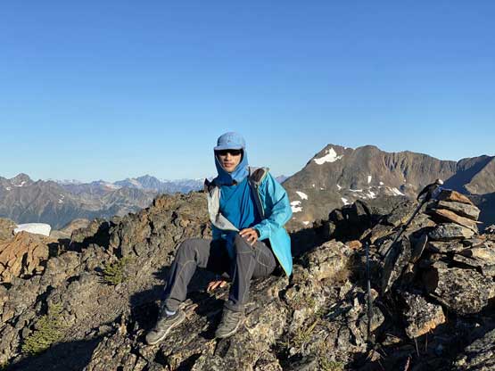 Alex had already done Star Mountain on his previous attempt to ascend Whitecap Mountain so Vlad and I woke up early and plodded eastward on our own. We managed to get going at around sunrise. We firstly had to plod over the shoulder of a small hump but we needed not have to ascend to the top of that hump. Then we easily descended to a set of alpine lakes where two groups were camping. When we passed by their tents they were still sleeping. The terrain on the plod to Star Mountain was surprisingly easy with no talus hopping nor side-hilling on steep grass, that we managed to make progress fairly quickly. The peak appeared fairly imposing from afar but Alex didn’t mention any difficulty on the ascent so we assumed the route just went up the west ridge. At the base of the scramble we ditched the backpacks. We did have to do some detouring on climber’s right side but generally stuck to the ridge crest. There were numerous false summits and the scrambling was “class 3” at most.