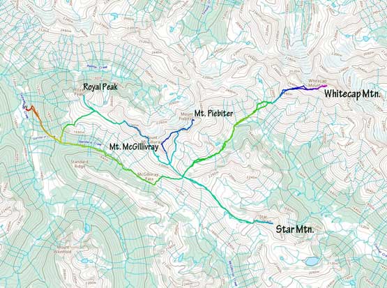 The views were pretty nice on the summit but we had a long day ahead so immediately turned around and plodded down. On the descent we found some easier bypasses to avoid the 3rd class sections and in no time we were back to the lakes. We loaded up the water bottles at a stream above the lakes, and then had a leisure plod back to camp. We would then break camp and move towards Mt. McGillivray.