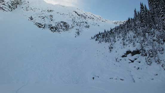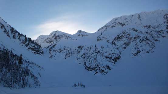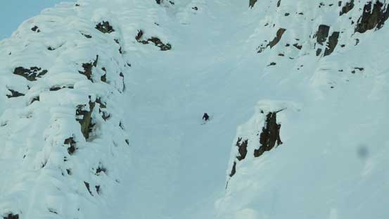 Keeping the skins on I quickly made my way back across the NW Ridge. Earlier in the day I already made a call to steep-ski one of the few couloirs on the NE side and upon approaching the planned one I was surprised to see a large group of skiers coming up this way. Not wanting to deal with a heavily tracked route I skipped the snack break, did a fast gear transition and then dropped into the couloir before those guys. The initial few turns were steep and committing thank to the crusty surface but after a while I entered some deep powder. From there on I got to enjoy perhaps one of the finest skiing I’ve done in the mountains, from high up on Steep Peak all the way to Darkside Lake. It was a blast and I certainly made a good call to haul the ski gears this high up.