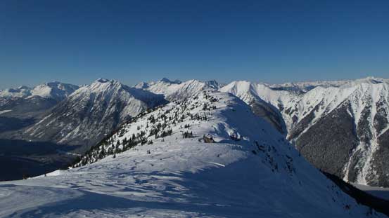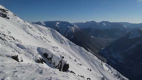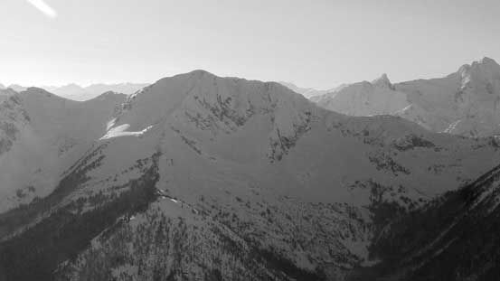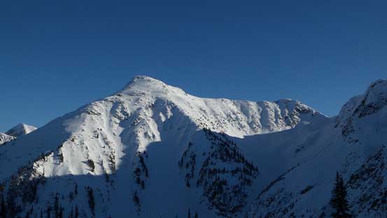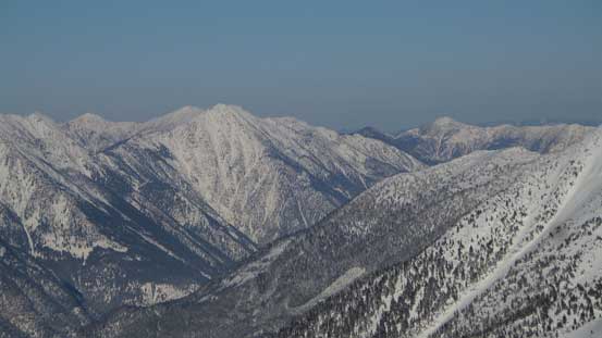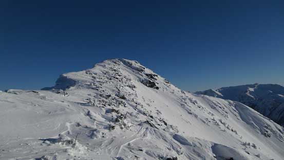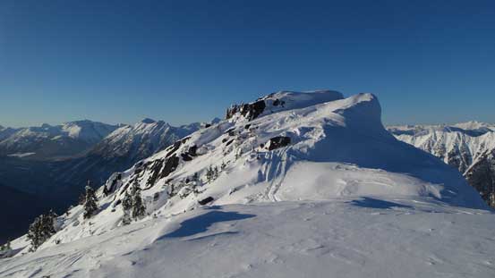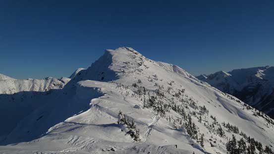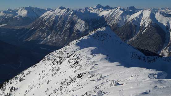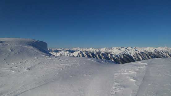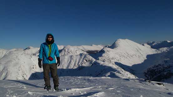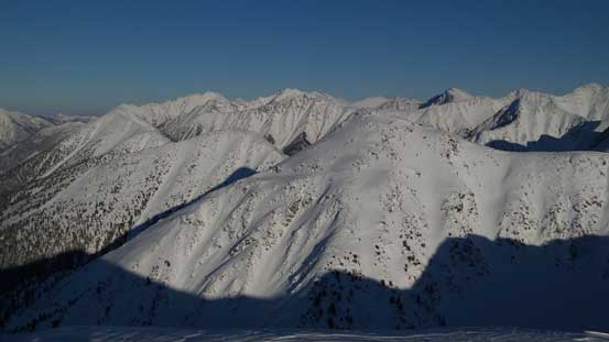 The bulk part of elevation gain was already behind but the traverse along NW Ridge was quite undulating with lots of micro-terrain. The views were amazing, but the drag was a bit longer than I thought so that by the time I eventually reached the summit I only had less than 1.5 hours of daylight time to spend. My original idea was traversing to the nearby “Peak 2318” but seeing the elevation drop ahead I wasn’t keen on that anymore.