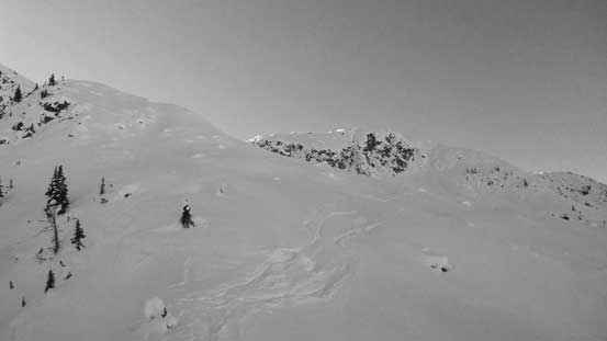With the impressive north face of Steep Peak looming in front showing how much work still required I didn’t want to waste too much time in the cabin, so out I went into the coldness again. There are multiple ways to access the long, undulating NW Ridge but the general direction is to hit the broad shoulder branching NE from the ridge. Straight up from the cabin provided a wooded path but I opted for a line further to the climber’s left utilizing a giant slide path. The condition was bomber and I didn’t want to deal with too much forested travel. The skin tracks were distinguishable but mostly drifted in so I had to break my own trail on top of others’ tracks. The trail-breaking wasn’t too bad as long as I stayed on the tracks and I slowly and steadily worked my way into the upper draw.
