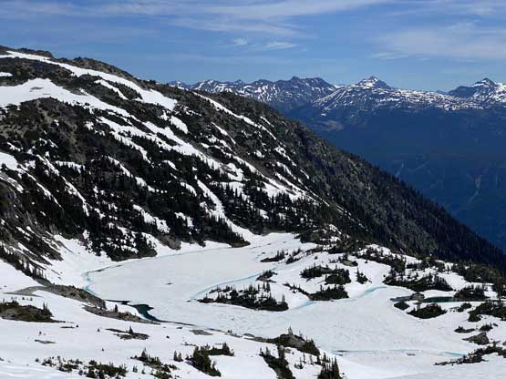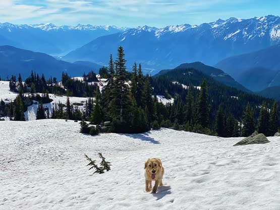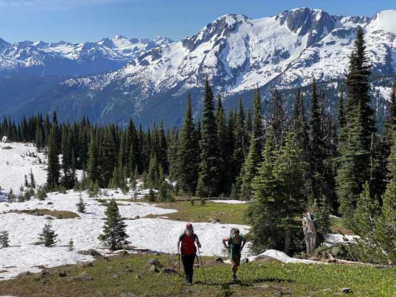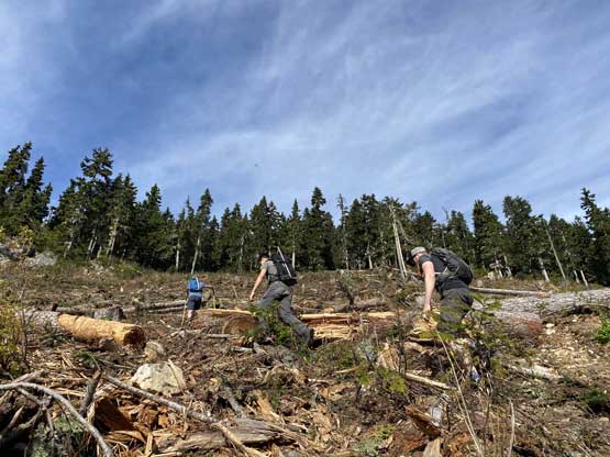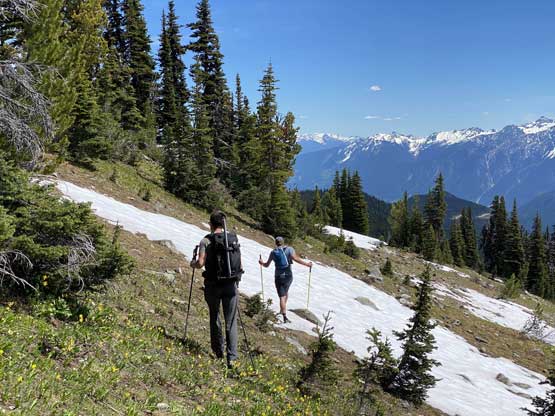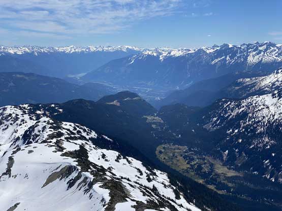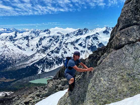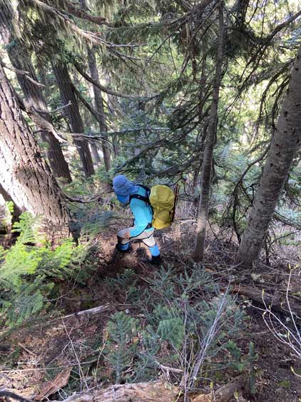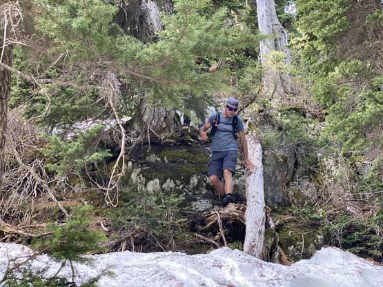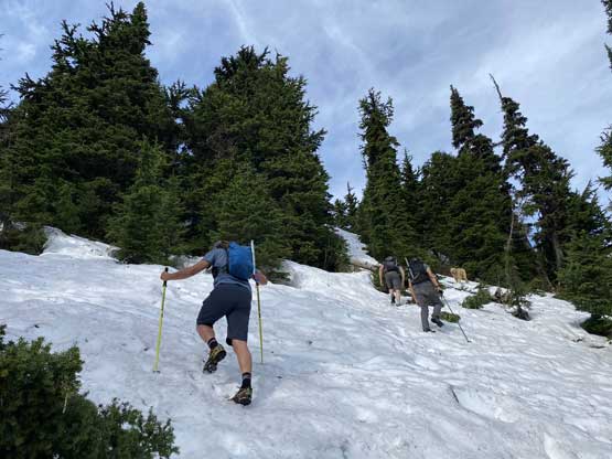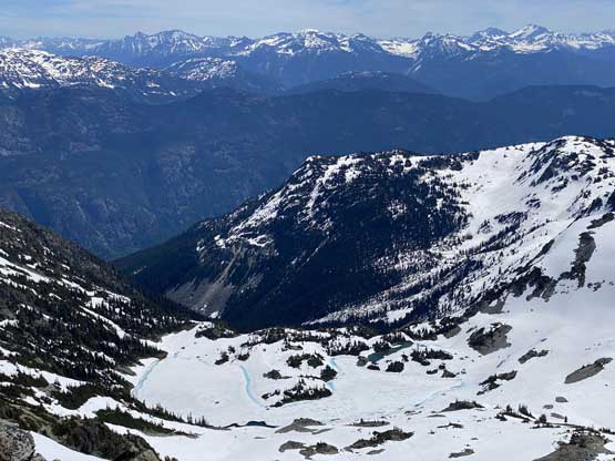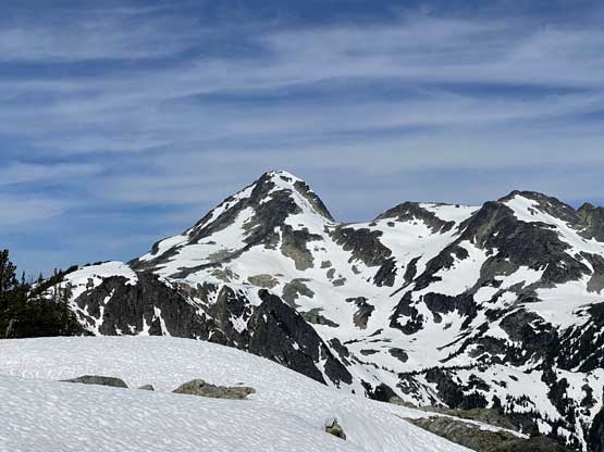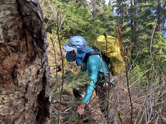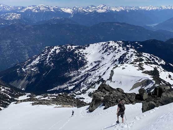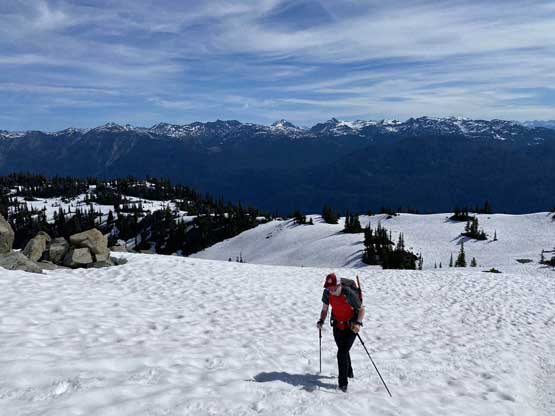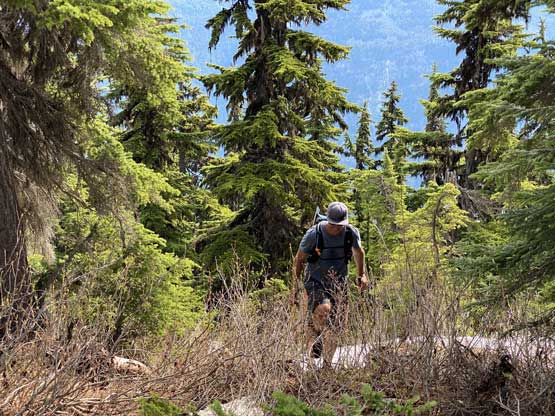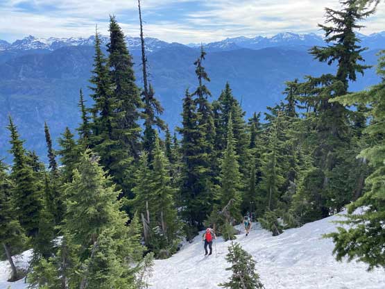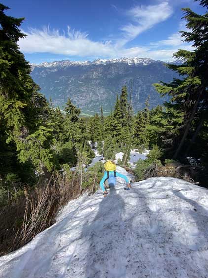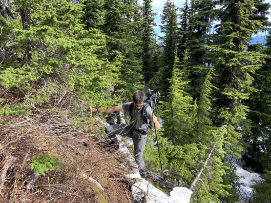 Normally the standard route goes to the far end of the SE Ridge but we decided to short-cut this long detour by bushwhacking straight up from where we parked. The cut-block wasn’t too bad to ascend and once in the forest we immediately found intermittent snow. Unfortunately the snowpack was no longer continuous at this time of a year so we did have to do some vege-belay bushwhacking here and there as well as scrambling up through some bluffs. There was a total of 300 vertical meters of this typical BC off-trail grunt before topping out on the ridge. Once on the ridge we pleasantly discovered a trail but the trail soon ended in continuous snow. On the ascent we opted to plod up and over all bumps on the ridge for simplicity.