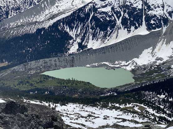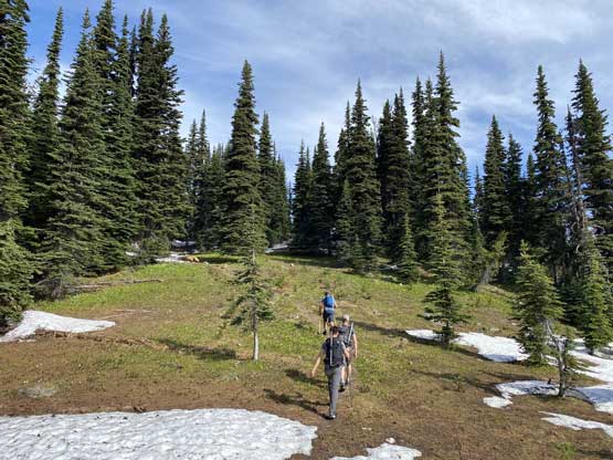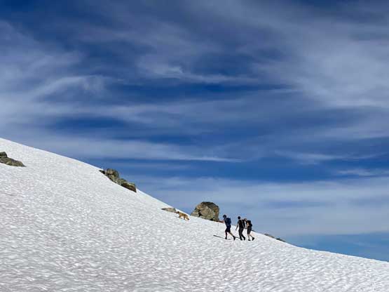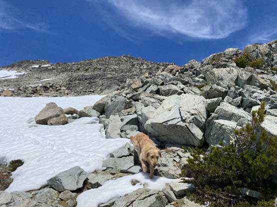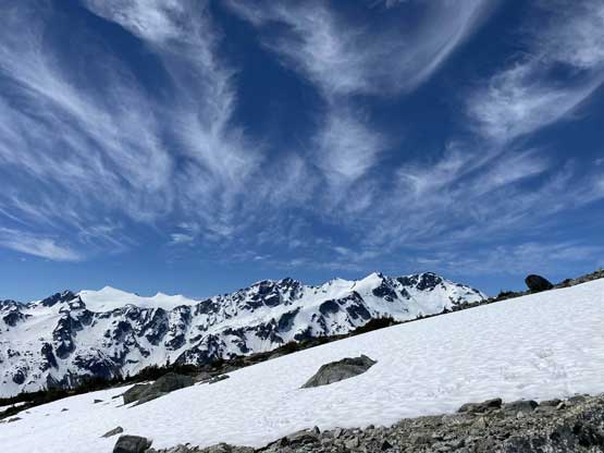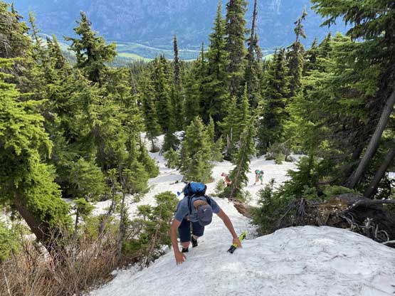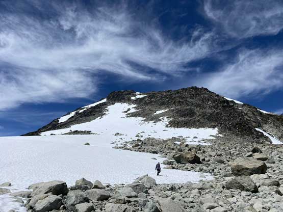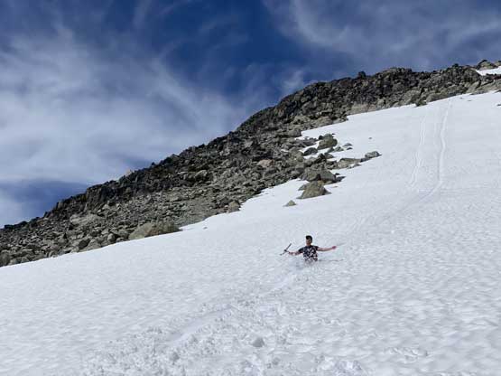 We lingered for at least an hour on the top soaking in the views but the heat’s taking a toll on us and we were all running low on water, so it’s time to descend. We linked up patches of snowfields and glissaded for as much as possible to save our knees. We opted to bypass that substantial bump by side-hilling on the south side. We might have saved some elevation regain but I doubt if we actually saved any time as the terrain was a bit unpleasant (not recommended). Lower down we decided to stick close to our ascent track and to embrace the bushes and the bluffs, which was surely unpleasant in some ways but wasn’t too bad.