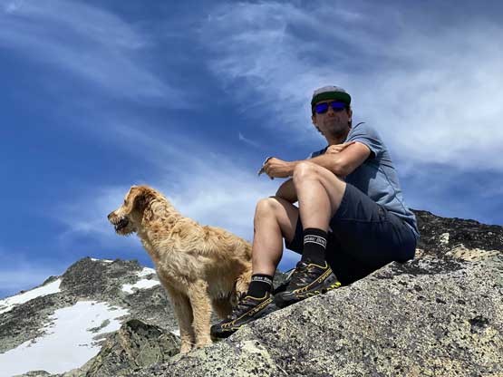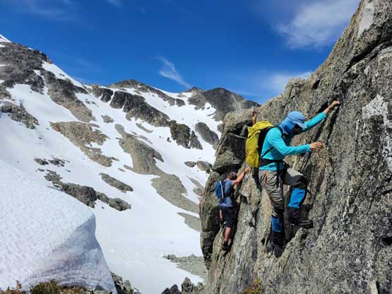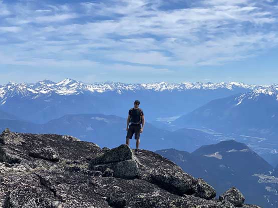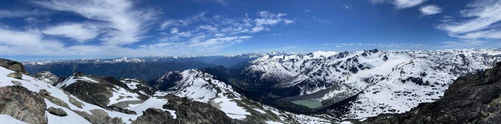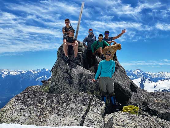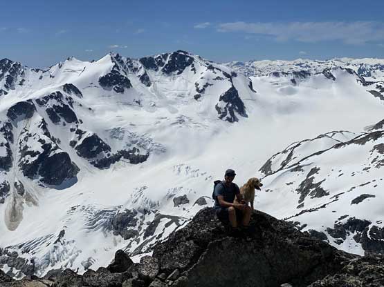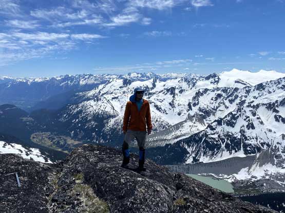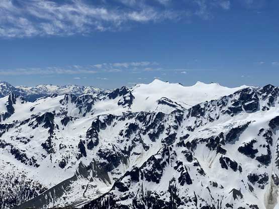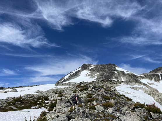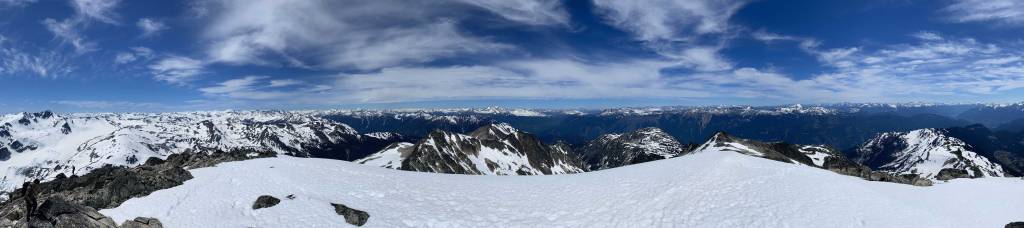 One bump required a substantial (>50 m) elevation loss that we descended quickly by glissading. Then we stuck reasonably close to the ridge crest on the edge between rocks/bushes and massive cornices for a few more horizontal kilometers to the base of the summit block. The summit block appeared daunting from afar but was actually not. Matt and I picked a route on the far climber’s right side scrambling up blocks of boulders. The route did seem to drag on for a long time. Eventually the slope angle petered out and we were back onto some snow fields and the next thing we had arrived at the summit. The true summit required a few 3rd class moves.