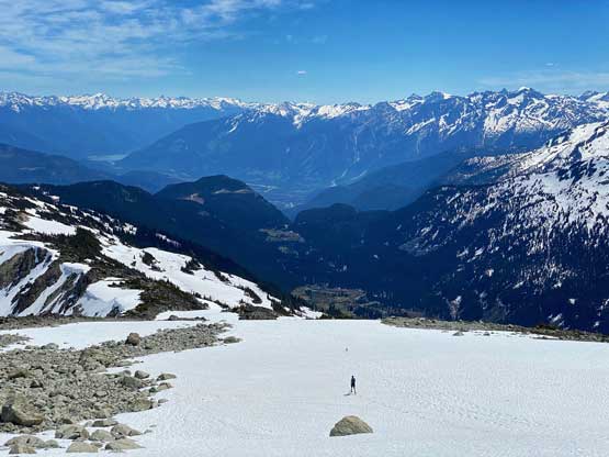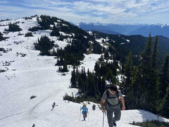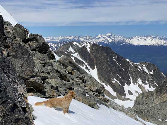 Normally the standard route goes to the far end of the SE Ridge but we decided to short-cut this long detour by bushwhacking straight up from where we parked. The cut-block wasn’t too bad to ascend and once in the forest we immediately found intermittent snow. Unfortunately the snowpack was no longer continuous at this time of a year so we did have to do some vege-belay bushwhacking here and there as well as scrambling up through some bluffs. There was a total of 300 vertical meters of this typical BC off-trail grunt before topping out on the ridge. Once on the ridge we pleasantly discovered a trail but the trail soon ended in continuous snow. On the ascent we opted to plod up and over all bumps on the ridge for simplicity.