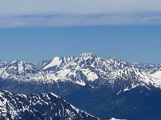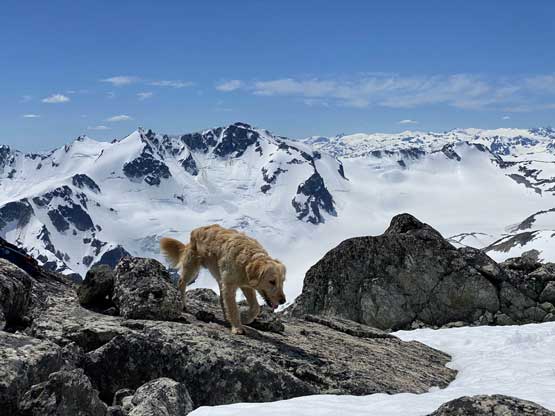 One bump required a substantial (>50 m) elevation loss that we descended quickly by glissading. Then we stuck reasonably close to the ridge crest on the edge between rocks/bushes and massive cornices for a few more horizontal kilometers to the base of the summit block. The summit block appeared daunting from afar but was actually not. Matt and I picked a route on the far climber’s right side scrambling up blocks of boulders. The route did seem to drag on for a long time. Eventually the slope angle petered out and we were back onto some snow fields and the next thing we had arrived at the summit. The true summit required a few 3rd class moves.