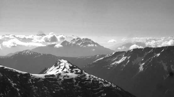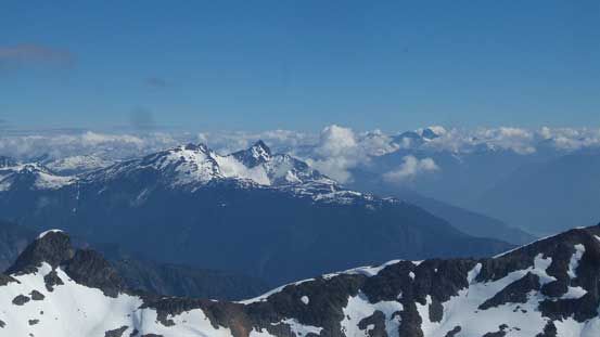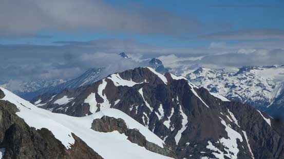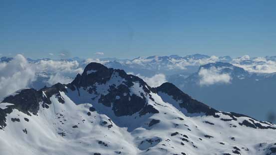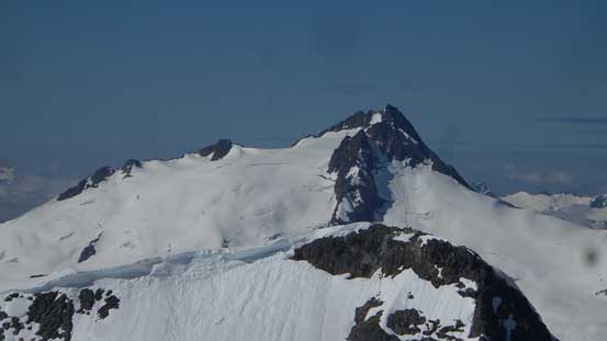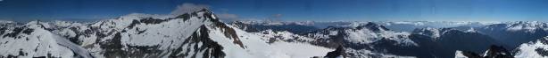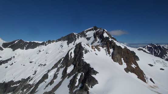 Nobody liked this snow route neither so once everyone got across safely we agreed to search for an alternative descent route, likely from Talon/Adieu col. This traverse dumped up on the uppermost of the east ridge and the scrambling to the summit was easy from there. The views were awesome with no smoke obscuring the peaks.