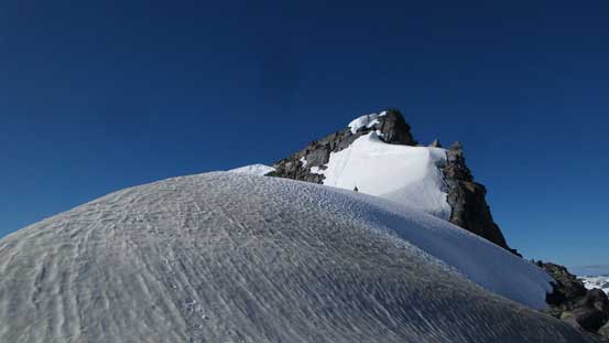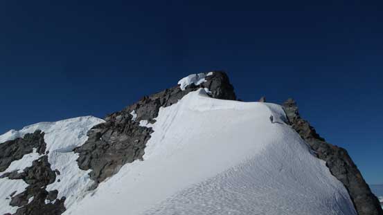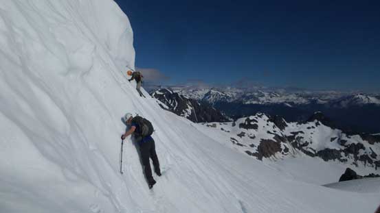 The start wasn’t too bad but the rocks were loose making slow progress in a group of 4. At places I just jumped onto snow and kicked albeit the snow line was a bit exposed. The angle eased off upon arriving at a snowy plateau but then steepened up considerably as we approaching the summit block. The last 20 meters was what we had worry about and we were right. Daniel was on the lead and after watching him struggling to make some 5th class moves the rest of us decided to bypass the technical climbing entirely on snow. This was not trivial neither as we must face into the slope and shuffle across a good stretch of the north face with slope angle increasing to about 50 degrees.