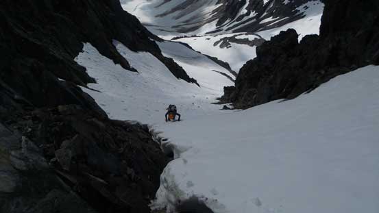 We spent at least half an hour on the summit soaking in the views and drying out the very soaked boots, but eventually it’s time to get going again. The north ridge of Adieu Mountain did not look easy at all but again, we had fate on the old beta. The first business now was to find a way down to Talon/Adieu col and even this was not trivial. Staying entirely on the rocky ridge was not too bad until a couple jagged towers forced to detour onto snow, down-climber’s left. A couple tricky moves to get into a steep couloir and then some longish down-climbing later we could finally start traversing back towards the col. This part was mostly side-hilling on soft snow so not too bad.
