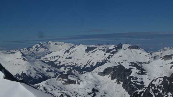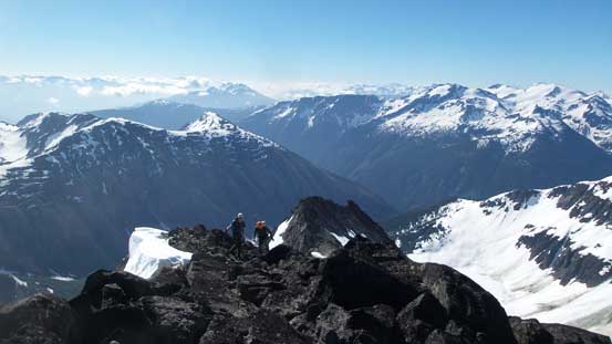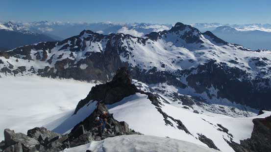 Nobody liked this snow route neither so once everyone got across safely we agreed to search for an alternative descent route, likely from Talon/Adieu col. This traverse dumped up on the uppermost of the east ridge and the scrambling to the summit was easy from there. The views were awesome with no smoke obscuring the peaks.