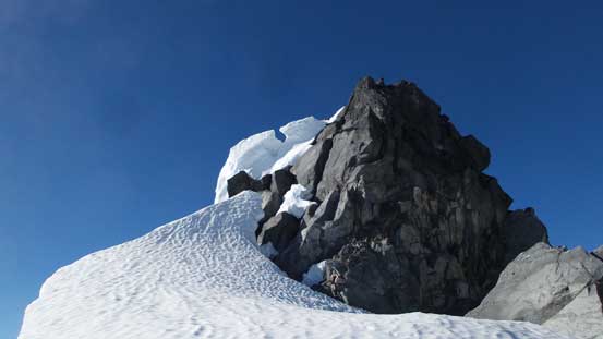 The start wasn’t too bad but the rocks were loose making slow progress in a group of 4. At places I just jumped onto snow and kicked albeit the snow line was a bit exposed. The angle eased off upon arriving at a snowy plateau but then steepened up considerably as we approaching the summit block. The last 20 meters was what we had worry about and we were right. Daniel was on the lead and after watching him struggling to make some 5th class moves the rest of us decided to bypass the technical climbing entirely on snow. This was not trivial neither as we must face into the slope and shuffle across a good stretch of the north face with slope angle increasing to about 50 degrees.