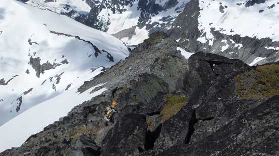 We spent at least half an hour on the summit soaking in the views and drying out the very soaked boots, but eventually it’s time to get going again. The north ridge of Adieu Mountain did not look easy at all but again, we had fate on the old beta. The first business now was to find a way down to Talon/Adieu col and even this was not trivial. Staying entirely on the rocky ridge was not too bad until a couple jagged towers forced to detour onto snow, down-climber’s left. A couple tricky moves to get into a steep couloir and then some longish down-climbing later we could finally start traversing back towards the col. This part was mostly side-hilling on soft snow so not too bad.