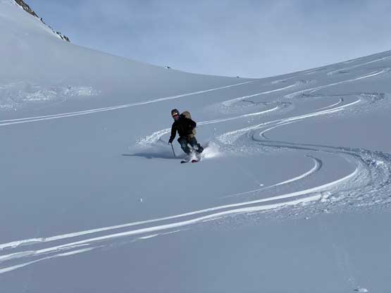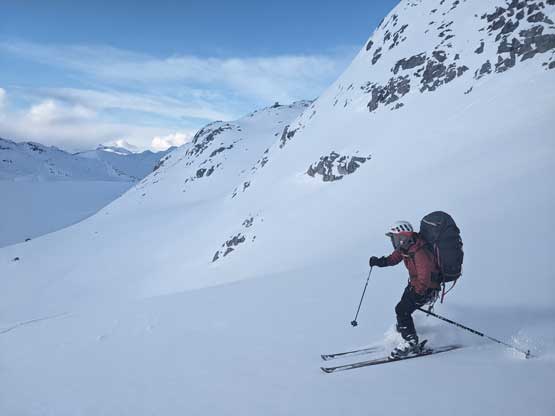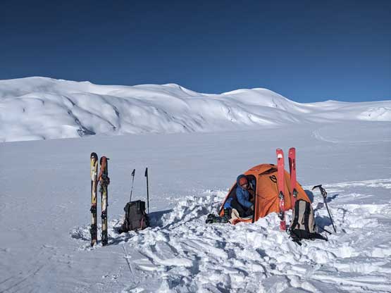 As soon as it made sense we ripped off the skins and started the 300+ meters of skiing down onto the icefield. The upper 1/4 had some challenging wind-affected snow but the lower slopes were much more sheltered and preserved some top quality powder. Even I was able to make easy turns even with the overnight pack. We rejoined the snowmobile tracks after descending onto the icefield and skid/skinned a few more kilometers towards “Torah Peak” before calling it a day. The evening was very cold but thankfully I had brought the trusty -32C Western Mountaineering Puma GWS bag for the night. Eric did the tent job while I played with the Reactor to melt snow. The fuel canister would go dead after a few minutes due to the coldness but we found a way or two to keep it running for the needs. Eric’s tent was a strong one, but not very spacious for the two of us, so the sleep was not very comfortable. I always thought my BD Hilight was the tightest 2-person tent but now I’d slept in a tighter one. There’s no way to get out of this tent without significantly disturbing the other’s sleep.