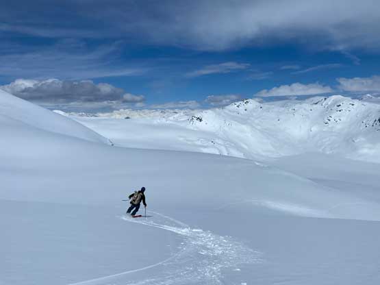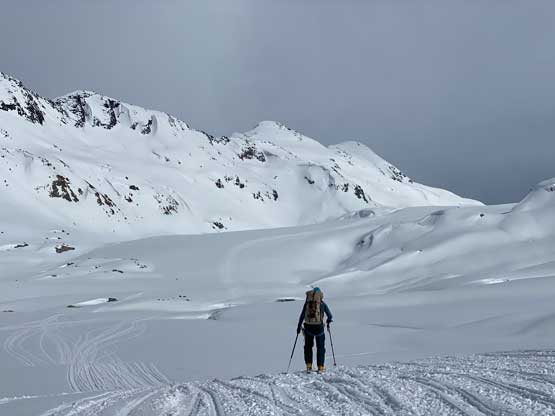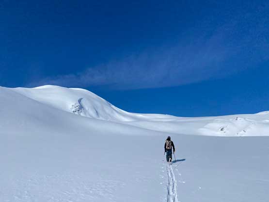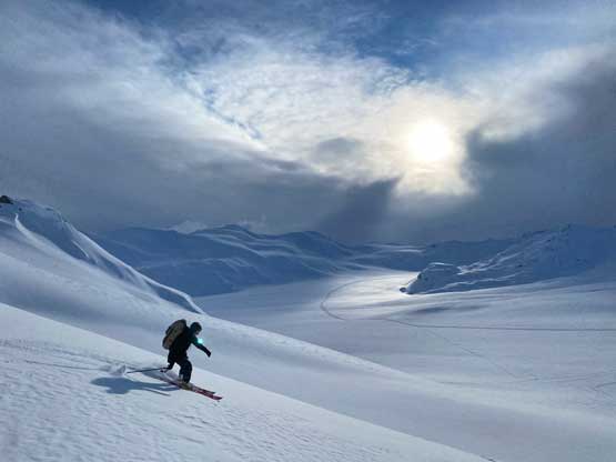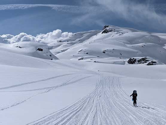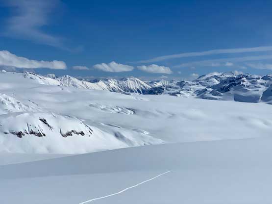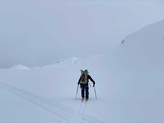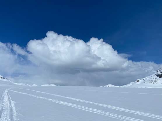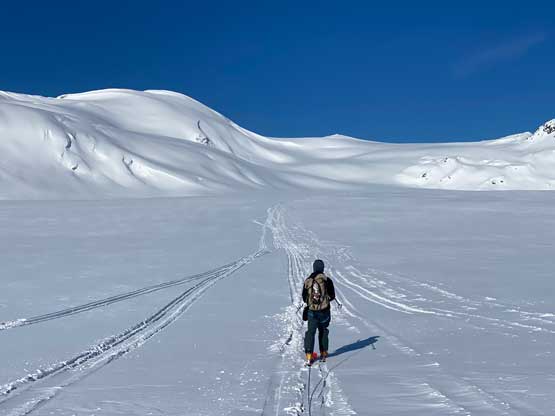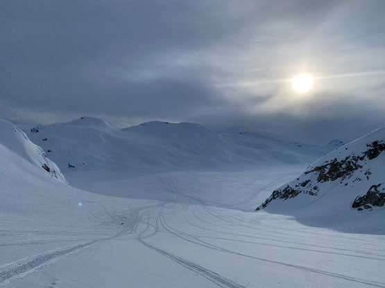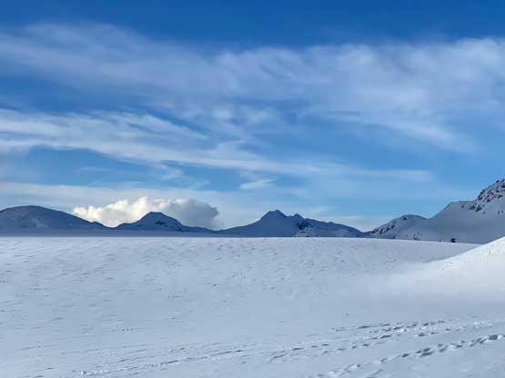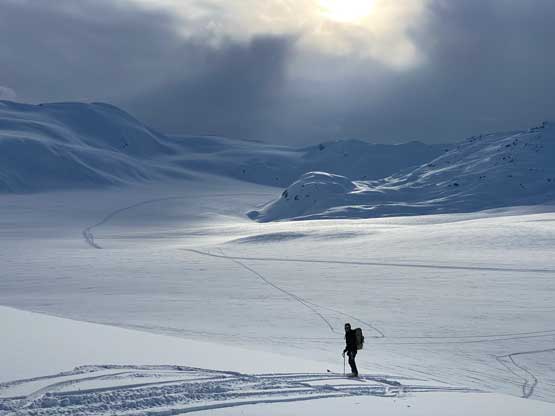 The most direct way to get back to the sled would be to reverse what we did a day earlier on “Famine Peak” area but such was complicated. We decided to take the long way around following the sled “highway”. This would double the distance, but did not need much brain power. It was a massively long plod to the “divide point” on the main icefield which is also the prominence col for Longspur Peak and from there we skied northwards down towards a frozen lake, losing over 300 m hard won elevation. We then wrapped around eastwards. The plod up the next glacier back to the sled would require over 500 m elevation gain and I was downright exhausted at this point. I could feel multiple blisters on each foot but the weather was closing in, the time was ticking and Eric was leading in front out of sight at times so I just had to suck it up and tough it out. Eventually Eric started to lead a short-cut to ascend the final 150 m to the snowmobile and the total distance we had covered on skis was about 34 km.