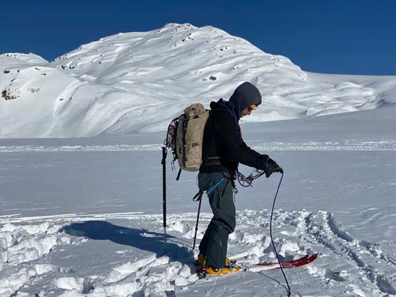We were tired so didn’t manage to wake up until 8 am in the morning and it was still brutally cold outside. Thankfully the sun beams were shone on us so the stoke level was high. None of us needed to cook anything in the morning so we quickly got going. I had brought some dehydrated meals (does not need to be booked) from a potential new sponsor to test them out and it was awesome. This really saved me from having to cook the ramen in the morning, which could be a real pain in this cold. We roped up for the ascent of “Torah Peak” as this peak had some large crevasses on the satellite images, even though most of the crevasses were filled in with the April’s snowpack. We followed the sled tracks for another 2-3 km before leaving them for our objective. The sled tracks all went northwards and stopped at a weird location with some flags probably for helicopters to land, so we suspected that must be a secret ice cave. However, peak-bagging took priority over curiosity.