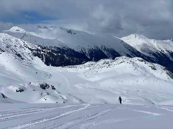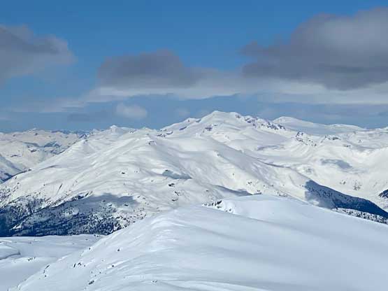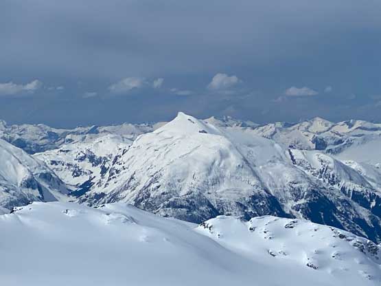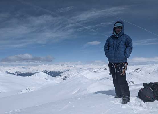 Eric and I then took turns breaking trail up the north slopes linking up several obvious ramps. The route-finding was straightforward but the slog was never-ending and extremely monotonous. I had to call for one food break after about 3 hours of non-stop skinning. The summit started to seem “close” but we still had to ascend/traverse a few rolls and bumps to get there. Once skinning onto the final summit ridge we were greeted by some fierce and cold winds, that despite the awesome views we could not linger too long up there.