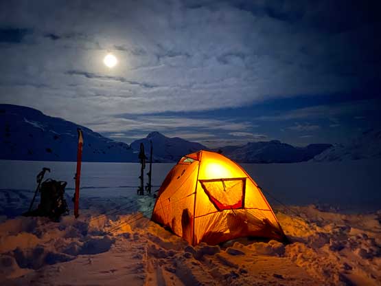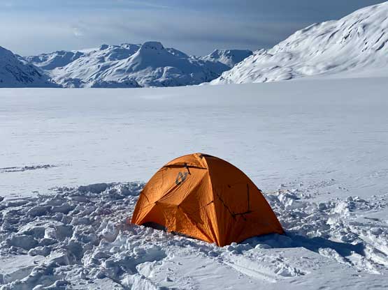 As soon as it made sense we ripped off the skins and started the 300+ meters of skiing down onto the icefield. The upper 1/4 had some challenging wind-affected snow but the lower slopes were much more sheltered and preserved some top quality powder. Even I was able to make easy turns even with the overnight pack. We rejoined the snowmobile tracks after descending onto the icefield and skid/skinned a few more kilometers towards “Torah Peak” before calling it a day. The evening was very cold but thankfully I had brought the trusty -32C Western Mountaineering Puma GWS bag for the night. Eric did the tent job while I played with the Reactor to melt snow. The fuel canister would go dead after a few minutes due to the coldness but we found a way or two to keep it running for the needs. Eric’s tent was a strong one, but not very spacious for the two of us, so the sleep was not very comfortable. I always thought my BD Hilight was the tightest 2-person tent but now I’d slept in a tighter one. There’s no way to get out of this tent without significantly disturbing the other’s sleep.