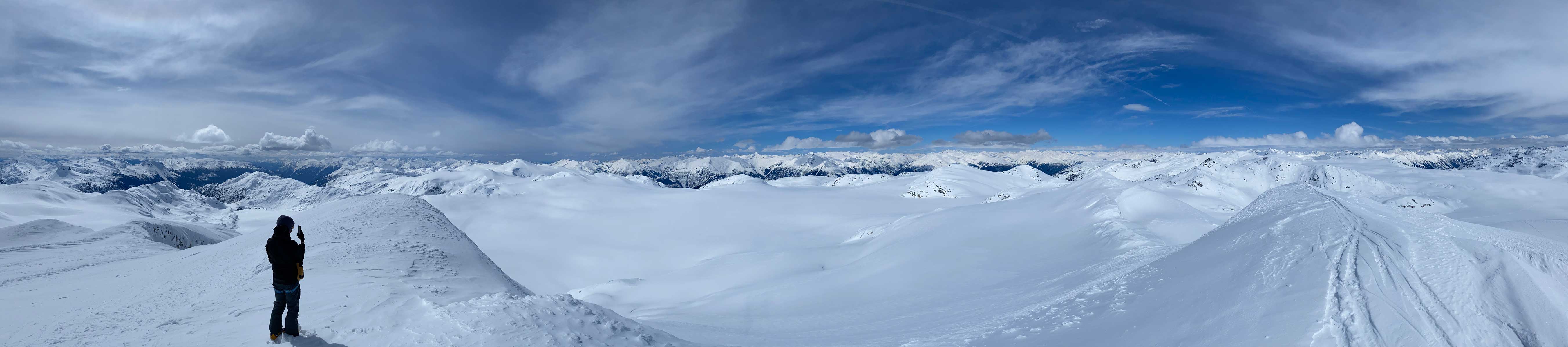 Eric and I then took turns breaking trail up the north slopes linking up several obvious ramps. The route-finding was straightforward but the slog was never-ending and extremely monotonous. I had to call for one food break after about 3 hours of non-stop skinning. The summit started to seem “close” but we still had to ascend/traverse a few rolls and bumps to get there. Once skinning onto the final summit ridge we were greeted by some fierce and cold winds, that despite the awesome views we could not linger too long up there.