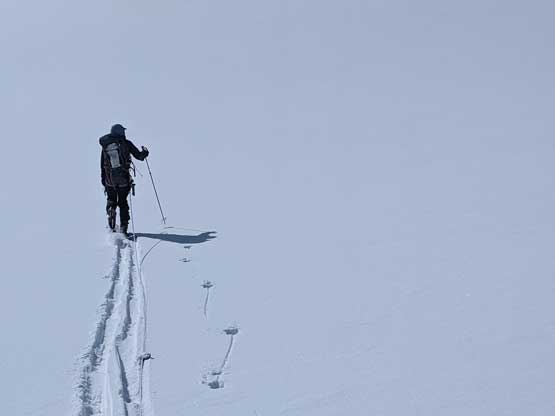 The most direct way to get back to the sled would be to reverse what we did a day earlier on “Famine Peak” area but such was complicated. We decided to take the long way around following the sled “highway”. This would double the distance, but did not need much brain power. It was a massively long plod to the “divide point” on the main icefield which is also the prominence col for Longspur Peak and from there we skied northwards down towards a frozen lake, losing over 300 m hard won elevation. We then wrapped around eastwards. The plod up the next glacier back to the sled would require over 500 m elevation gain and I was downright exhausted at this point. I could feel multiple blisters on each foot but the weather was closing in, the time was ticking and Eric was leading in front out of sight at times so I just had to suck it up and tough it out. Eventually Eric started to lead a short-cut to ascend the final 150 m to the snowmobile and the total distance we had covered on skis was about 34 km.
