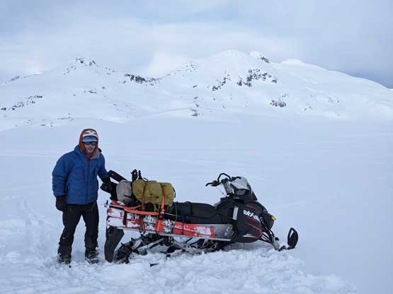 “Torah Peak” is the unofficial name given to a deep and remote summit in the heart of Pemby Icecap that also boasts over 300 m prominence. This peak is almost entirely glaciated on all sides. Using a snowmobile to sled a few hours in from Rutherford FSR is pretty much the only logical way of getting in. With some experience one can sled over 50 km each way and get to within an hour or two’s skinning to the summit of “Torah Peak”. There are some other methods of getting in for those without a snowmobile including a traverse up and over Exodus Peak from the south, but all of those would be multi-day fairs. I’m only aware of one group that summitted this peak sans snowmobile.