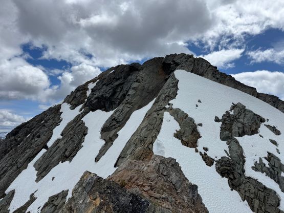 I decided for us to do “Crystal Peak” first as it’s the taller of the two. It’s unfortunately the more boring option but I had done no research beforehand. I simply followed the set of GPX tracks downloaded from peakbagger.com traversing towards climber’s right and it seemed to me there are many ways. We found some running streams to refill the water bottles, and this east-facing valley was still currently covered in snow in most places. I had not brought an ice axe nor crampons but the snow condition was soft that the trail-runners were more than sufficient. There’s one steeper (30-degrees) snow slope to ascend near the top of this valley but it could be bypassed had we looked for an alternative. We were then on the south ridge of “Crystal Peak”, and the true summit involved a surprisingly airy gap to traverse across. The scrambling was class 2 at the maximum but the exposure was real.