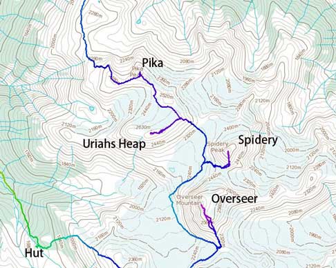 “Uriah’s Heap” is just another small summit that got its name unofficially assigned during the construction of Harrison Hut in the 1980s. This peak does not look “sexy” from Harrison Hut area hence few people, other than the stubborn peak-baggers would bother to consider an ascent. It appears like a pile of scree and to get there requires crossing Madhorse Glacier as well as ascending a steep pile of moraine type of loose boulders. For Adam (Gimplator) and myself this was done as part of a loop traverse and the route we took was the (relatively) aesthetic E/NE Ridge.